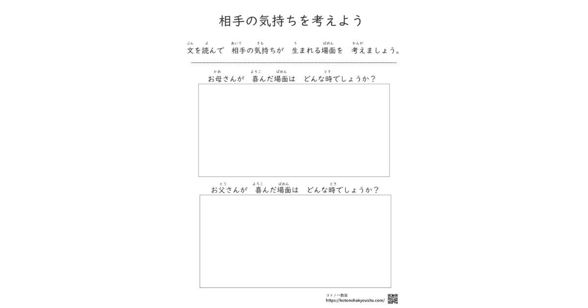 HOME > 無料教材 > SSTや気持ちを学ぶ教材 > 相手の気持ちを考えよう【無料プリント】~相手の立場になって気持ちを考えるワーク・プリント~ 2024年9月15日 お母さんやお父さん、お友達も自分と同様の気持ちを感じます。このプリントを使ってそれぞれの感じる気持ちについて考えてみましょう。 相手の気持ちを考えよう【無料ダウンロード】 ①相手の気持ちを考えよう(お母さん・お父さん:喜ぶ) ②相手の気持ちを考えよう(お母さん・お父さん:悲しい) ③相手の気持ちを考えよう(お母さん・お父さん:悲しい) ④相手の気持ちを考えよう(お母さん・お父さん:怒った) ⑤相手の気持ちを考えよう(友達:喜ぶ・ 悲しい) ⑥相手の気持ちを考えよう(友達:怒った・ 驚いた) 中高生のためのSSTワーク コミュニケーション編濱野 智恵2,420円(12/11 17:56時点)Amazon楽天市場Amazonの情報を掲載しています -SSTや気持ちを学ぶ教材 -教材