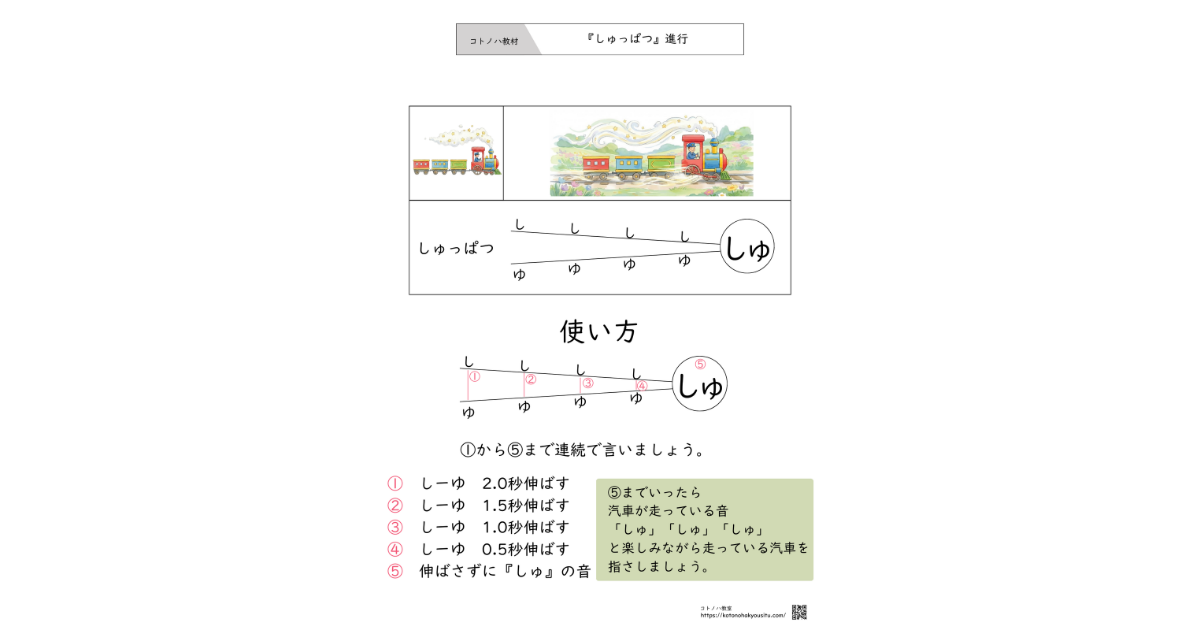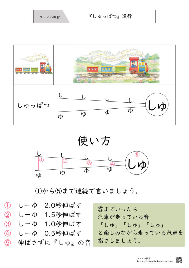 このプリントは、汽車の出発進行に合わせて、「し」と「ゆ」の音を少しずつ近づけていく楽しい練習シートです。