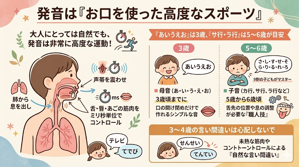 私たち大人は息をするように言葉を話していますが、実は「発音」というのは、肺から息を出し、声帯を震わせ、舌・唇・あごなどの筋肉をミリ秒単位で細かくコントロールしなければならない、非常に高度な運動です。