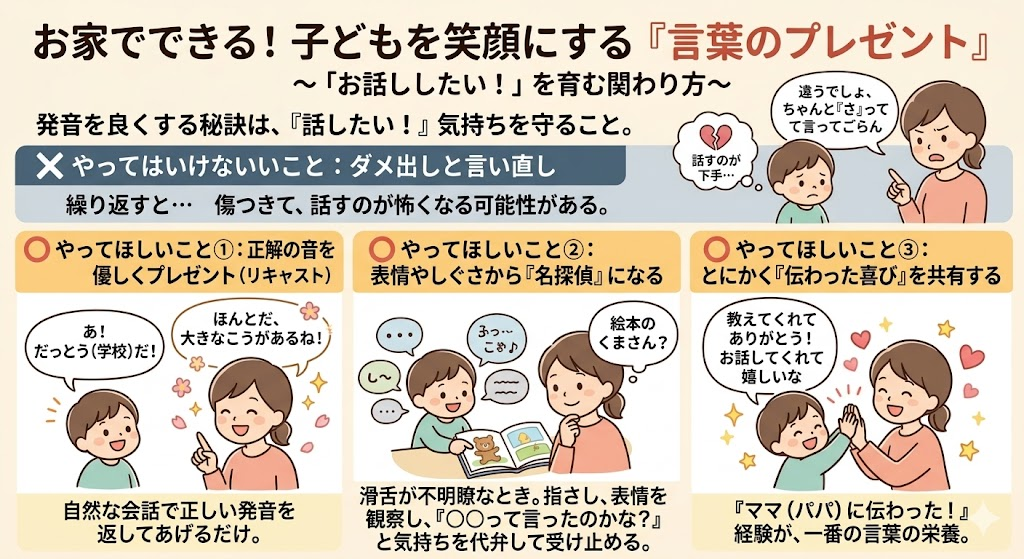 発音を良くするために一番大切なのは、お子さんの「お話ししたい!」という気持ちを大切に守り育てることです。ご家庭で今日からできる関わり方をご紹介します。