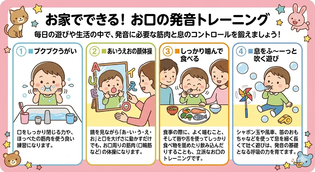 発音に必要な息のコントロールや、舌・唇の筋肉は、毎日の遊びや生活の中で鍛えることができます。