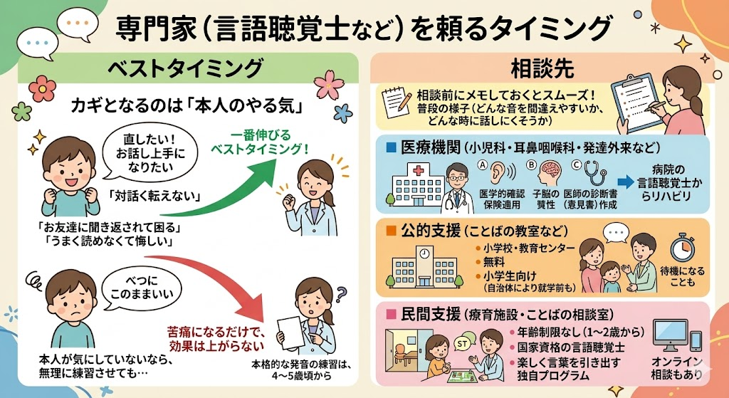「家でのサポートだけでは不安」「専門家に発音の練習(構音訓練)をお願いしたい」と考えたとき、いつ始めるのがベストなのでしょうか。