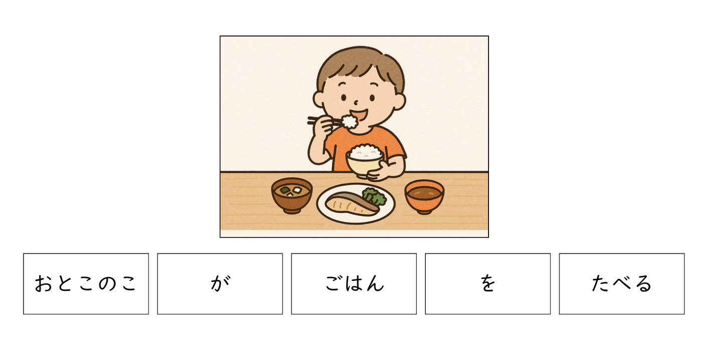 イラストとひらがなカードを切り取って使ってください。2語文や3語文など言葉のレベルに応じながら正しい文になるように並べるように学習を進めてみてください。