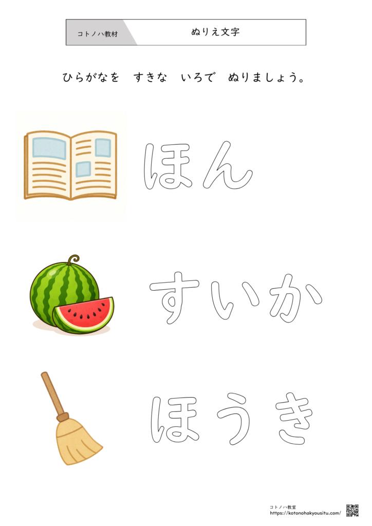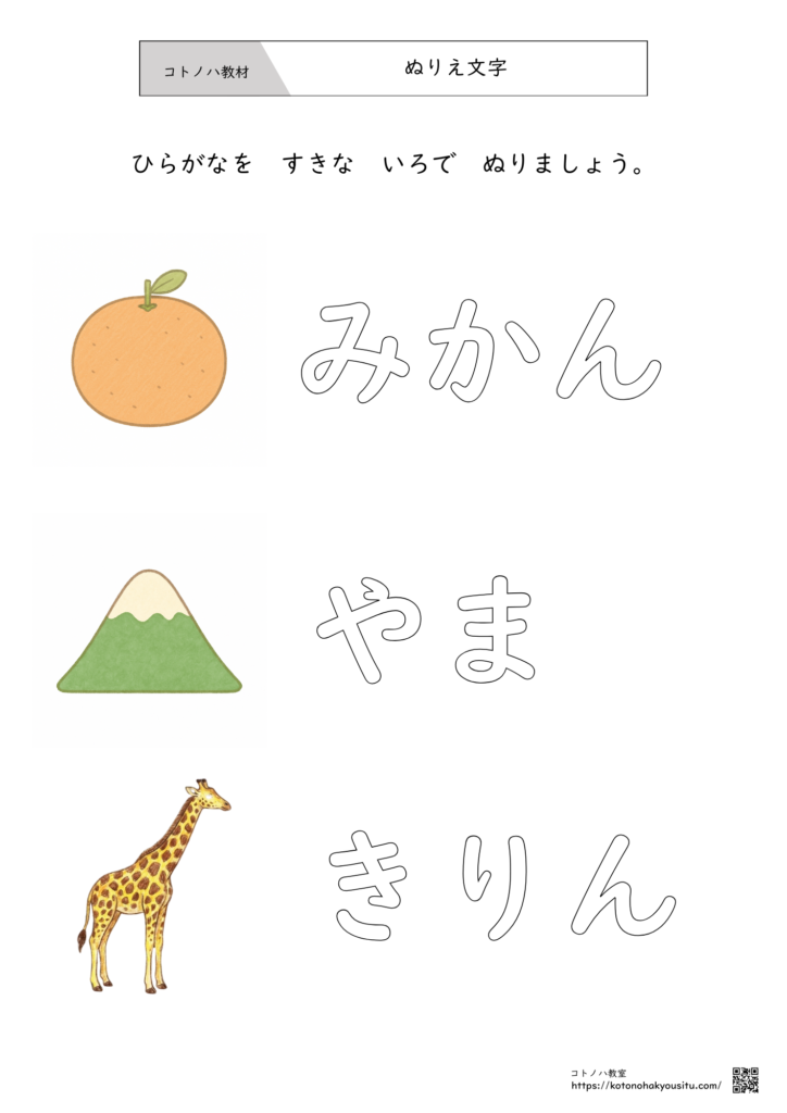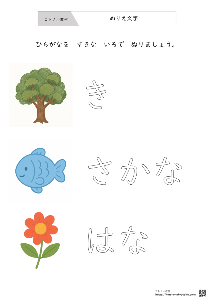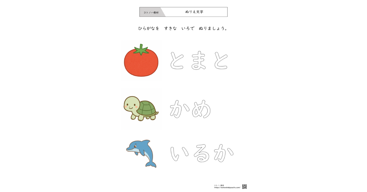 文字の中を好きな色で塗りつぶす遊びを通して、自然と文字の形を視覚的に捉え、正しい運筆の基礎を養います。