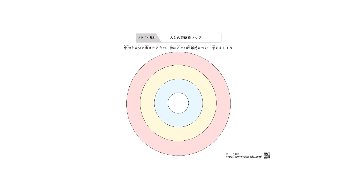 HOME > 無料教材 > SSTや気持ちを学ぶ教材 > 人との距離感マップ【無料プリント】~人との距離感を色に分けて考える 2024年9月7日 人との距離感を、自分を中心に考えて青色、黄色、赤色と段々と遠くなるように考える学習プリントです。 人との距離感マップ【無料ダウンロード】 ①人との距離感マップ ②人との距離感マップ -SSTや気持ちを学ぶ教材 -教材