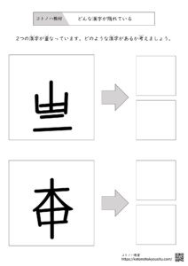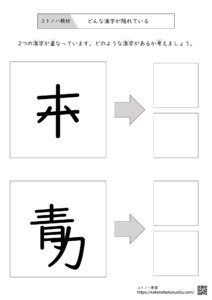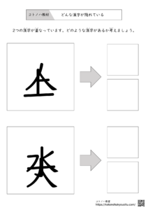 2つの漢字が重なっています。それを見てどのような漢字が書かれているか考えるプリントです。