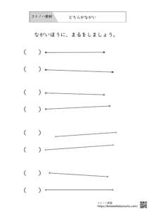 HOME > 無料教材 > 数の学習 > どちらがながい【無料プリント】~形や線を見比べてどちらが長いか学習 2025年4月23日 形や線を見比べてどちらが長いか学習するプリントです。 どちらがながい【無料ダウンロード】 ①どちらがながい ②どちらがながい ③どちらがながい ④どちらがながい <おすすめ教材>ことば・ひらがな・社会性・気持ちの学習に役立つ教材集ことばの学習やひらがな練習、社会性や気持ちを考え学習など、子どもの発達を支える教材をまとめました。どれも家庭や学校、療育の場で手軽に使えるものばかりです。言葉の学習で役立つ本、教材ひらがな指導に役立つ本SST・気持ちの学習に役立つ本、教材 -数の学習 -教材
