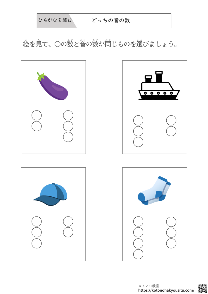 イラストに描かれていることばと同じ音の数を選ぶプリントです。ひらがなを読めなくても音の数を手掛かりに進められるプリントとなっています。