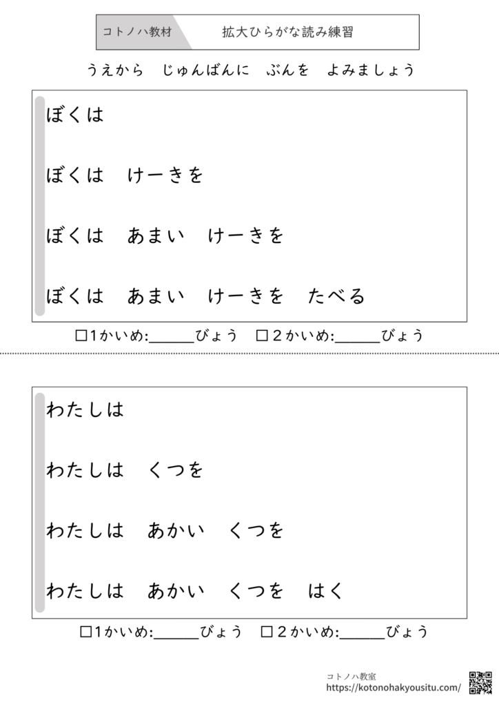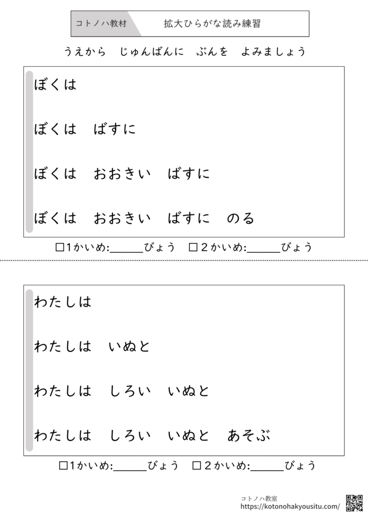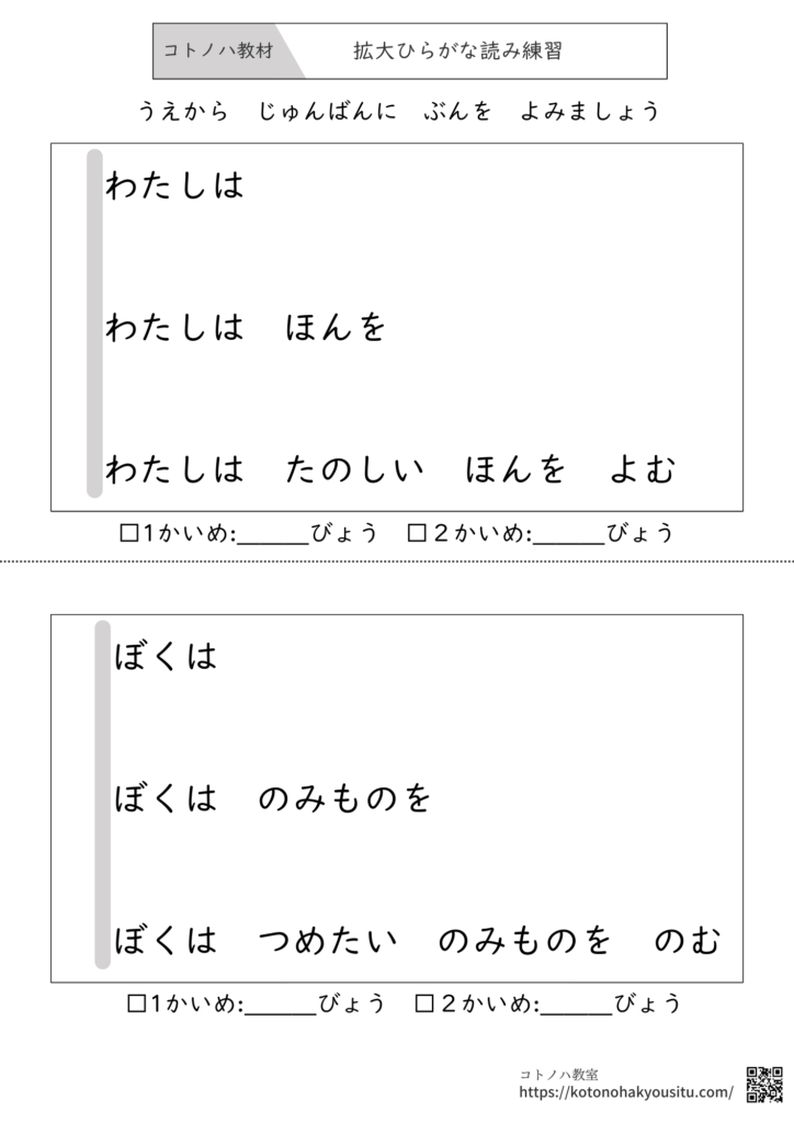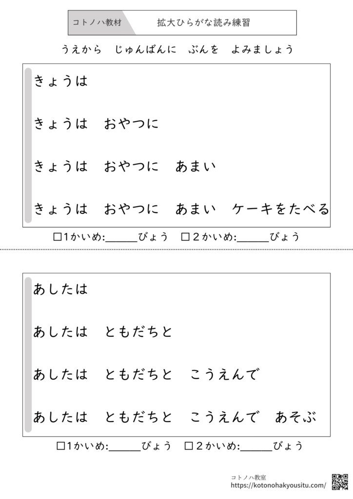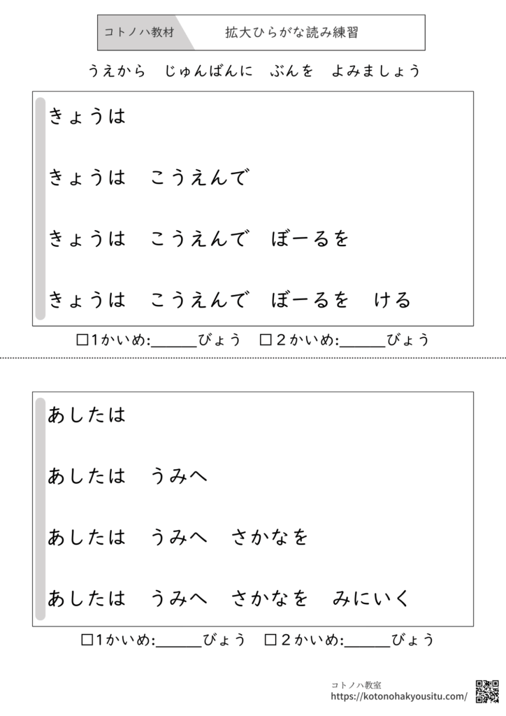 そこで今回は、無理なく「すらすら読む」感覚がつかめる『拡大ひらがな読み練習』を作りました。