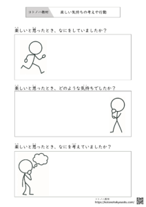HOME > 無料教材 > SST気持ち教材 > 様々な感情の気持ちの考えや行動【無料プリント】~楽しい、イライラした気持ちについて考えるプリント 2024年11月24日 楽しい、イライラした気持ちなどに対して、その気持ちになったきっかけや考えなどを考えるプリントとなっています。 楽しい気持ちの考えや行動【無料ダウンロード】 ①楽しい気持ちの考えや行動 ②楽しい気持ちの考えや行動 イライラした気持ちの考えや行動【無料ダウンロード】 ①イライラした気持ちの考えや行動 ②イライラした気持ちの考えや行動 イライラした気持ちの考えや行動Ⅱ【無料ダウンロード】 ①イライラした気持ちの考えや行動Ⅱ <おすすめ教材>ことば・ひらがな・社会性・気持ちの学習に役立つ教材集ことばの学習やひらがな練習、社会性や気持ちを考え学習など、子どもの発達を支える教材をまとめました。どれも家庭や学校、療育の場で手軽に使えるものばかりです。言葉の学習で役立つ本、教材ひらがな指導に役立つ本SST・気持ちの学習に役立つ本、教材 -SST気持ち教材