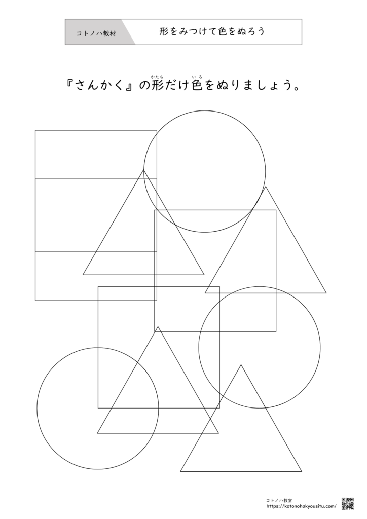 背景の中から特定の形を見つけ出す練習です。「黒板の文字を書き写す」「探し物を見つける」など、日常生活や学習に必要な「見る力(集中力)」を養います。