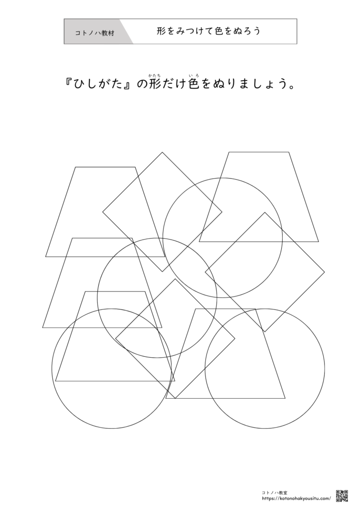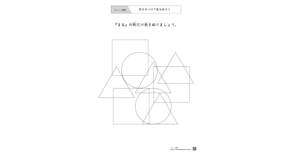 線が重なっていますが、よく見ると 形が あります。『まる』 の形だけを探し出して、色を ぬりましょう。