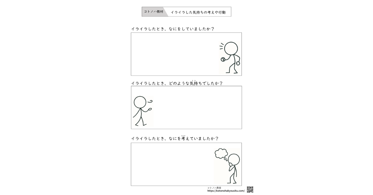 HOME > 無料教材 > SST気持ち教材 > イライラした気持ちの考えや行動【無料プリント】 2026年1月22日 イライラした気持ちの考えや行動【無料ダウンロード】 ①イライラした気持ちの考えや行動 ②イライラした気持ちの考えや行動 子どものためのアンガーマネージメント・ワークブック:イライラ、ムカムカとうまくつきあう50のトレーニング ¥2,200 (2026/01/26 20:57時点 | Amazon調べ) Amazon \楽天ポイント4倍セール!/ 楽天市場 ポチップ 子ども認知行動療法 怒り・イライラを自分でコントロールする! ¥1,229 (2026/01/26 20:57時点 | Amazon調べ) Amazon \楽天ポイント4倍セール!/ 楽天市場 ポチップ <おすすめ教材>ことば・ひらがな・社会性・気持ちの学習に役立つ教材集ことばの学習やひらがな練習、社会性や気持ちを考え学習など、子どもの発達を支える教材をまとめました。どれも家庭や学校、療育の場で手軽に使えるものばかりです。言葉の学習で役立つ本、教材ひらがな指導に役立つ本SST・気持ちの学習に役立つ本、教材 -SST気持ち教材 -教材