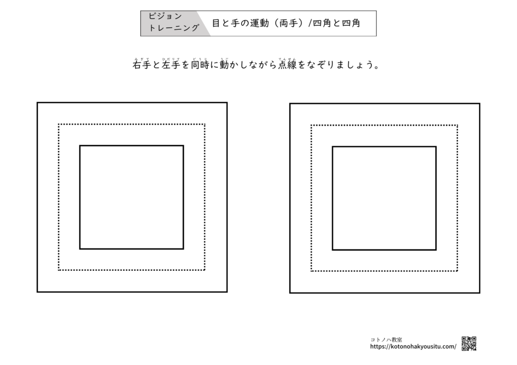 HOME > 無料教材 > ビジョントレーニング > 目と手の運動(両手)【無料プリント】~左右の手を動かす 2024年12月15日 両手の動きを意識しながら図形の中の線を書き進めるプリントです。 目と手の運動(両手)の使い方 目と手の運動(両手)【無料ダウンロード】 ①目と手の運動(両手)丸と丸 ①目と手の運動(両手)四角と四角 ①目と手の運動(両手)四角と四角 学習・運動が好きになる 1日5分!眼と体を楽しく動かす ビジョントレーニング・ワークブック ¥1,604 (2026/01/28 08:01時点 | Amazon調べ) Amazon 楽天市場 ポチップ 1日5分!はじめてのビジョントレーニング【わくわくパズル&ゲーム】 ¥1,650 (2026/01/28 08:02時点 | Amazon調べ) Amazon 楽天市場 ポチップ -ビジョントレーニング -教材