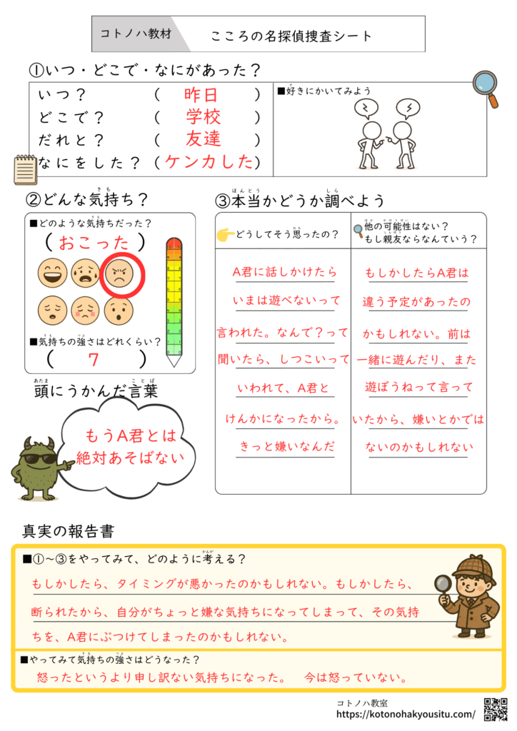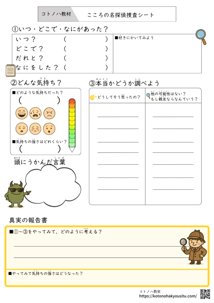 HOME > 無料教材 > SST気持ち教材 > こころの名探偵捜査シート【無料プリント】事件のナゾを解き明かそう 2024年12月10日 ①~③の手順について考えて、実際にどのような気持ちに変化したのか考えるプリントです。 こころの名探偵捜査シート【無料ダウンロード】 ①こころの名探偵捜査シート ②こころの名探偵捜査シート 子どものための認知療法練習帳ガイドブック ¥237 (2026/02/01 18:53時点 | Amazon調べ) Amazon \楽天ポイント4倍セール!/ 楽天市場 ポチップ 子どもの怒りに対する認知行動療法ワークブック ¥3,300 (2026/02/01 18:53時点 | Amazon調べ) Amazon \楽天ポイント4倍セール!/ 楽天市場 ポチップ <おすすめ教材>ことば・ひらがな・社会性・気持ちの学習に役立つ教材集ことばの学習やひらがな練習、社会性や気持ちを考え学習など、子どもの発達を支える教材をまとめました。どれも家庭や学校、療育の場で手軽に使えるものばかりです。言葉の学習で役立つ本、教材ひらがな指導に役立つ本SST・気持ちの学習に役立つ本、教材 -SST気持ち教材