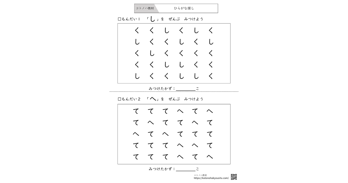 「く」と「し」のような簡単なレベルから、「ぬ」と「め」のような難問レベルまで、全12問のステップアップ方式になっています。 文字を探す名探偵になった気分で取り組んでみてださい。
