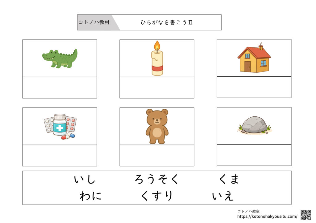 今回は、下の選択肢から正しい言葉を選んで書き写す「ひらがなを書こうⅡ」を作成しました。
