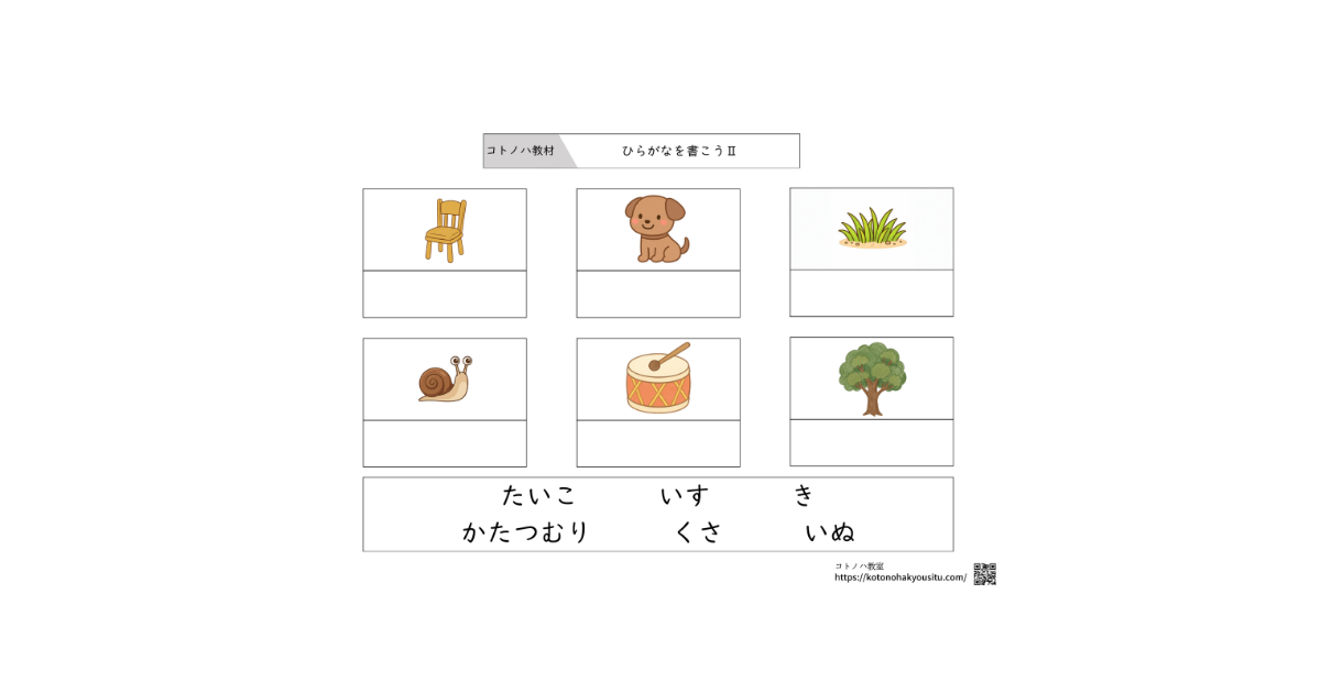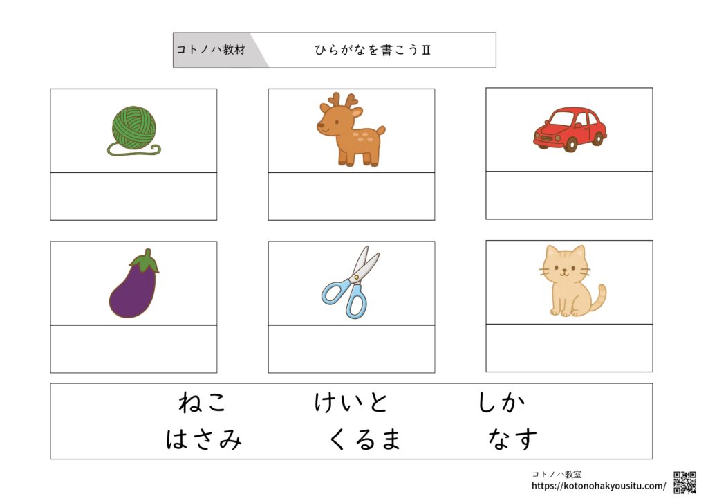 言葉とイラストのマッチング(語彙の確認)と、お手本を見ながら正しく形を写す(視写)練習が同時にできる教材です。