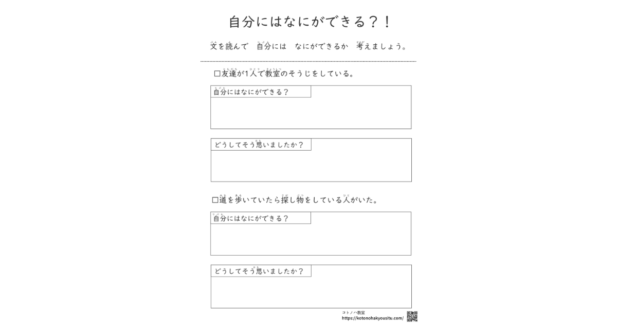 困っている人や場面に遭遇した時にどのようにするのか考えるプリントです。