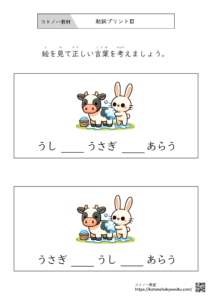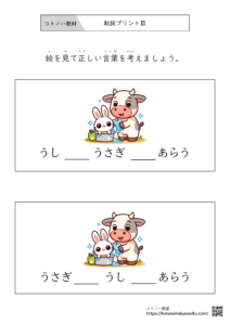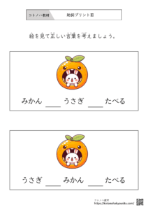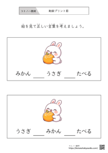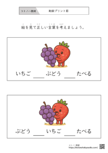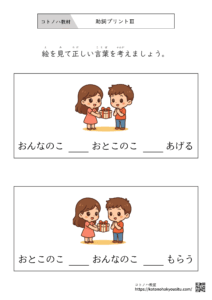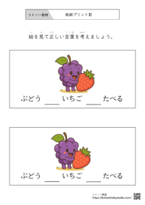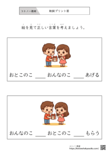 HOME > 無料教材 > 言葉の教材 > 助詞プリントⅢ【無料プリント】~助詞の位置や意味を意識する 2025年12月6日 正しい2つの助詞を入れて絵にあった文を完成させましょう。助詞の位置や意味を意識しながら学習してみてください。 助詞プリントⅢ【無料ダウンロード】 ①助詞プリントⅢ ②助詞プリントⅢ ③助詞プリントⅢ ④助詞プリントⅢ ⑤助詞プリントⅢ ⑥助詞プリントⅢ ⑦助詞プリントⅢ ⑧助詞プリントⅢ ⑨助詞プリントⅢ ⑩助詞プリントⅢ ⑪助詞プリントⅢ コロロメソッドで学ぶ ことばの発達ワークシート(1) 因果関係と理由 編1,980円(01/11 12:56時点)Amazon楽天市場Amazonの情報を掲載しています コロロメソッドで学ぶ ことばの分類ワークシート: スモールステップでマスターするものの名前・ことばの概念2,420円(01/11 12:56時点)Amazon楽天市場Amazonの情報を掲載しています 助詞プリント【無料プリント】~2語文・3語文などに必要な助詞を学習する助詞学習で活用できるプリントを用意しています。助詞部分を考えるプリントや助詞ではなく目的語などを考えるプリントなど、個々の指導に応じながら使ってください。 助詞プリント文字なし 助詞プリントⅠ 絵を見 ... -言葉の教材 -教材