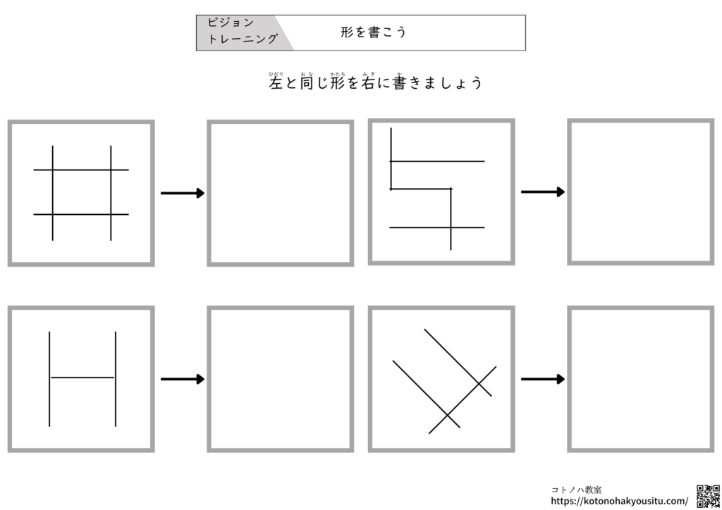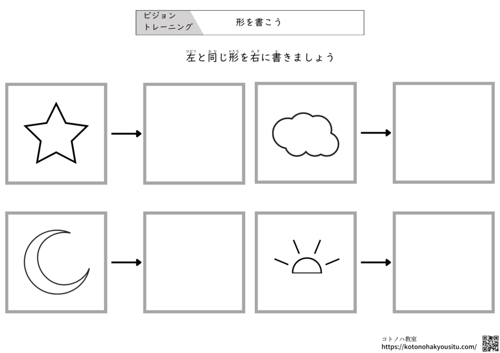 ②右側の枠の中に左の形と同じものを書く