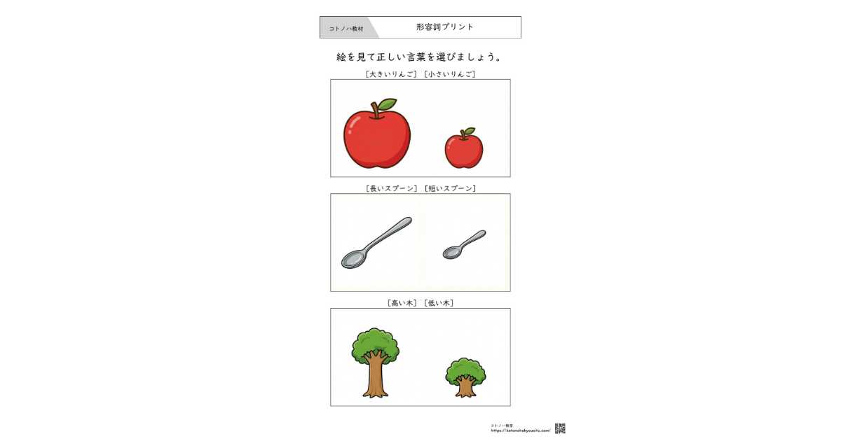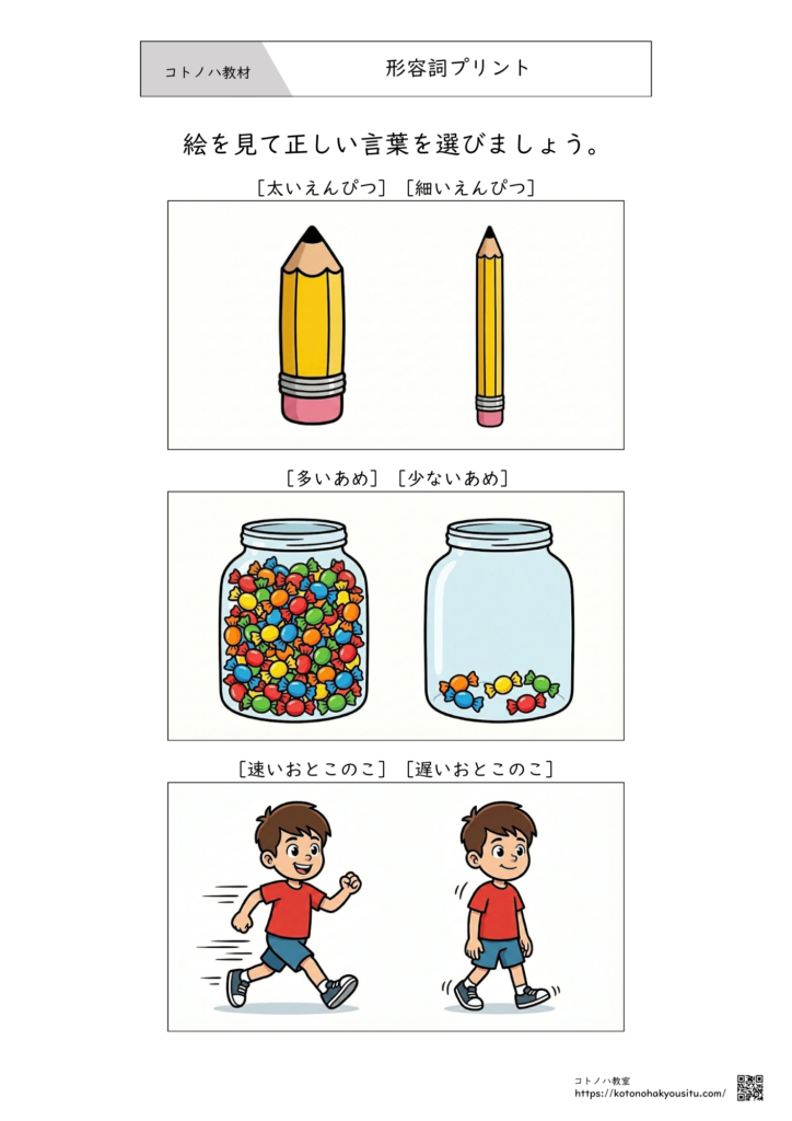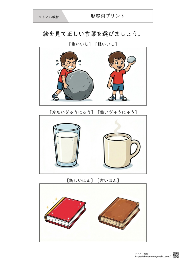 2つの絵を見比べながら形容詞を学ぶ構成となっております。必要に応じて切り取ったり、質問した言葉に〇をつけてもらうなどの学習方法で活用ください。