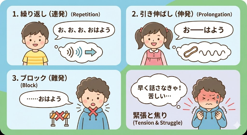 吃音には、話すことに困難さを生じさせる主な症状が3つあります。