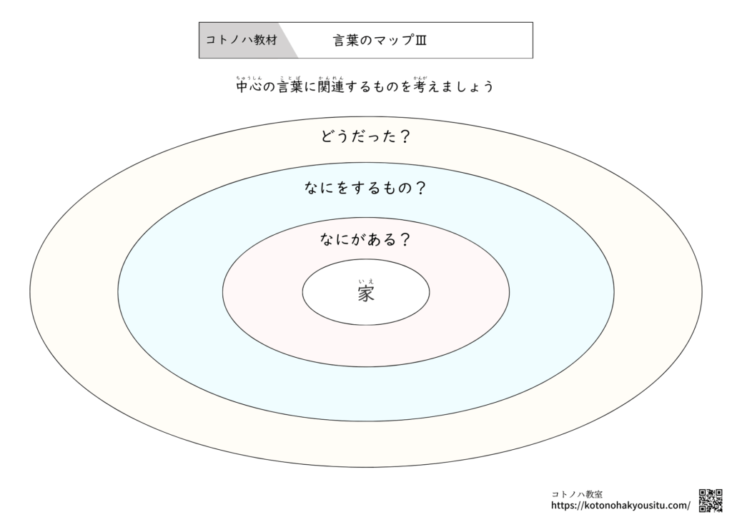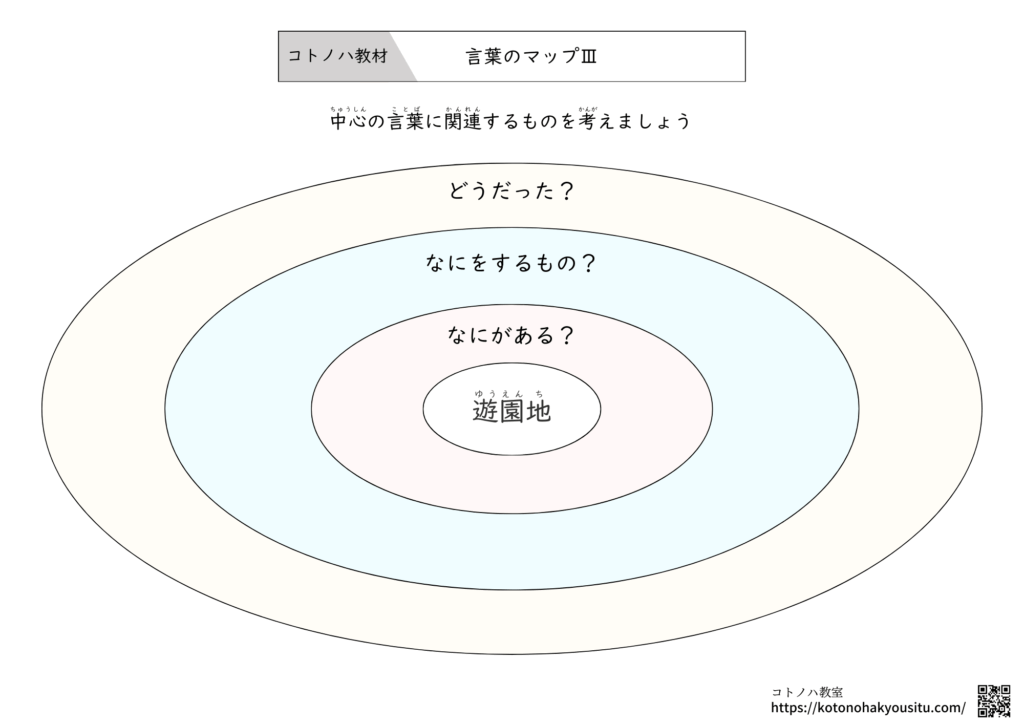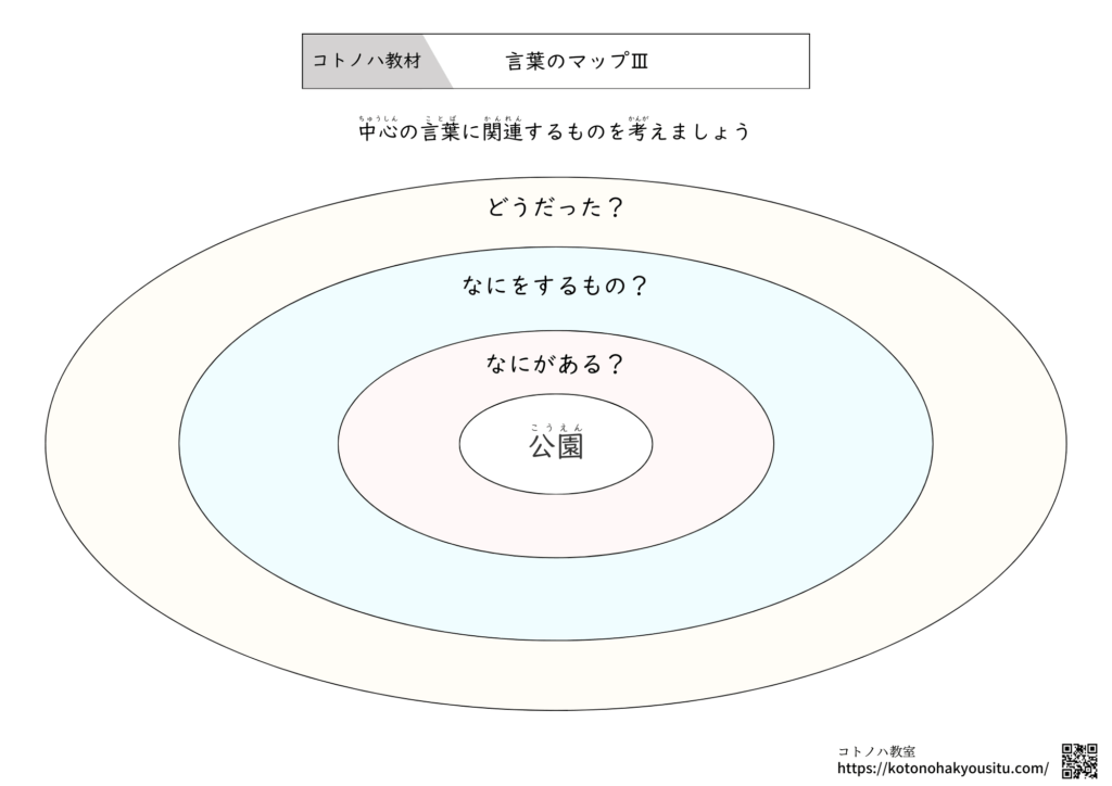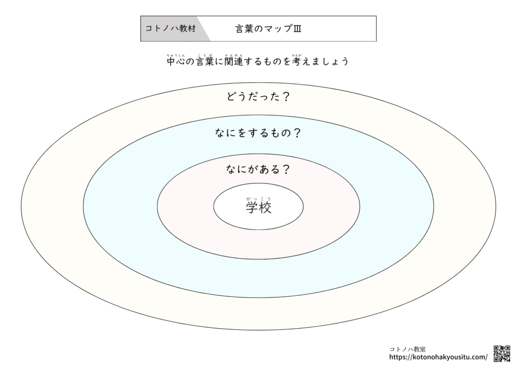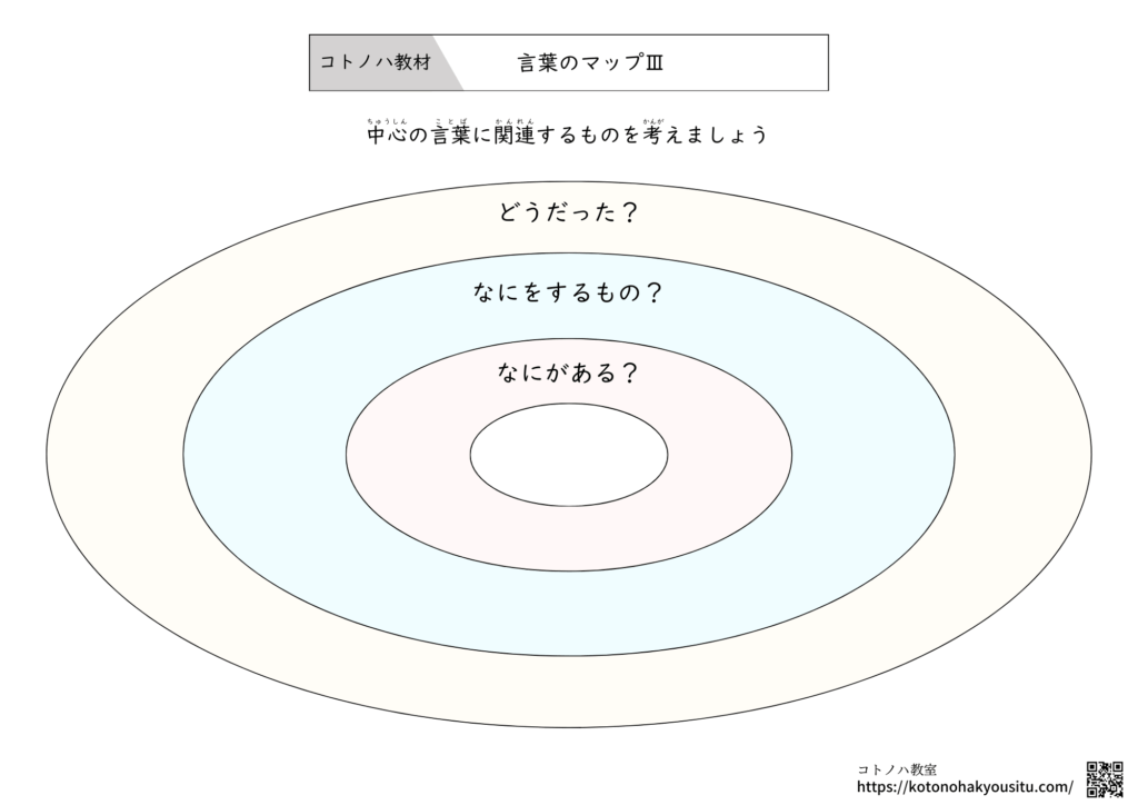 HOME > 無料教材 > 言葉の教材 > 言葉のマップⅢ【無料プリント】~何がある?何をするもの?どんな気持ちになる?を考える 2025年12月7日 中心のテーマとなる言葉をみて、何がある?何をするもの?どんな気持ちになる?を考える学習プリントです。 言葉のマップⅢ【無料ダウンロード】 ①言葉のマップⅢ ②言葉のマップⅢ・フリーテーマ ③言葉のマップⅢ ④言葉のマップⅢ ⑤言葉のマップⅢ ⑥言葉のマップⅢ コロロメソッドで学ぶ ことばの発達ワークシート(1) 因果関係と理由 編1,980円(01/11 12:56時点)Amazon楽天市場Amazonの情報を掲載しています 特別支援教育 「話したい!」をひきだす わくわく♪ことば教材秋元瑞帆, 小原路乃2,420円(01/11 13:42時点)Amazon楽天市場Amazonの情報を掲載しています 言葉のマップ【無料プリント】~関連する言葉を考えよう決められたテーマに沿った関連する言葉を挙げるプリントです。指定したテーマだけでなく、フリーテーマとして、好きなテーマを設定して活用することもおすすめです。 言葉のマップⅢ【無料プリント】 ダウンロード ... -言葉の教材 -教材