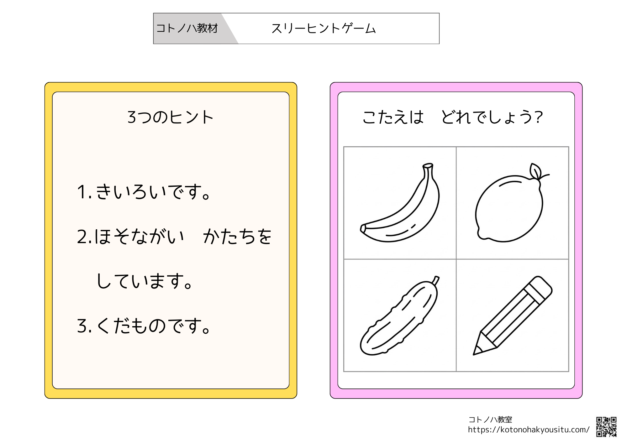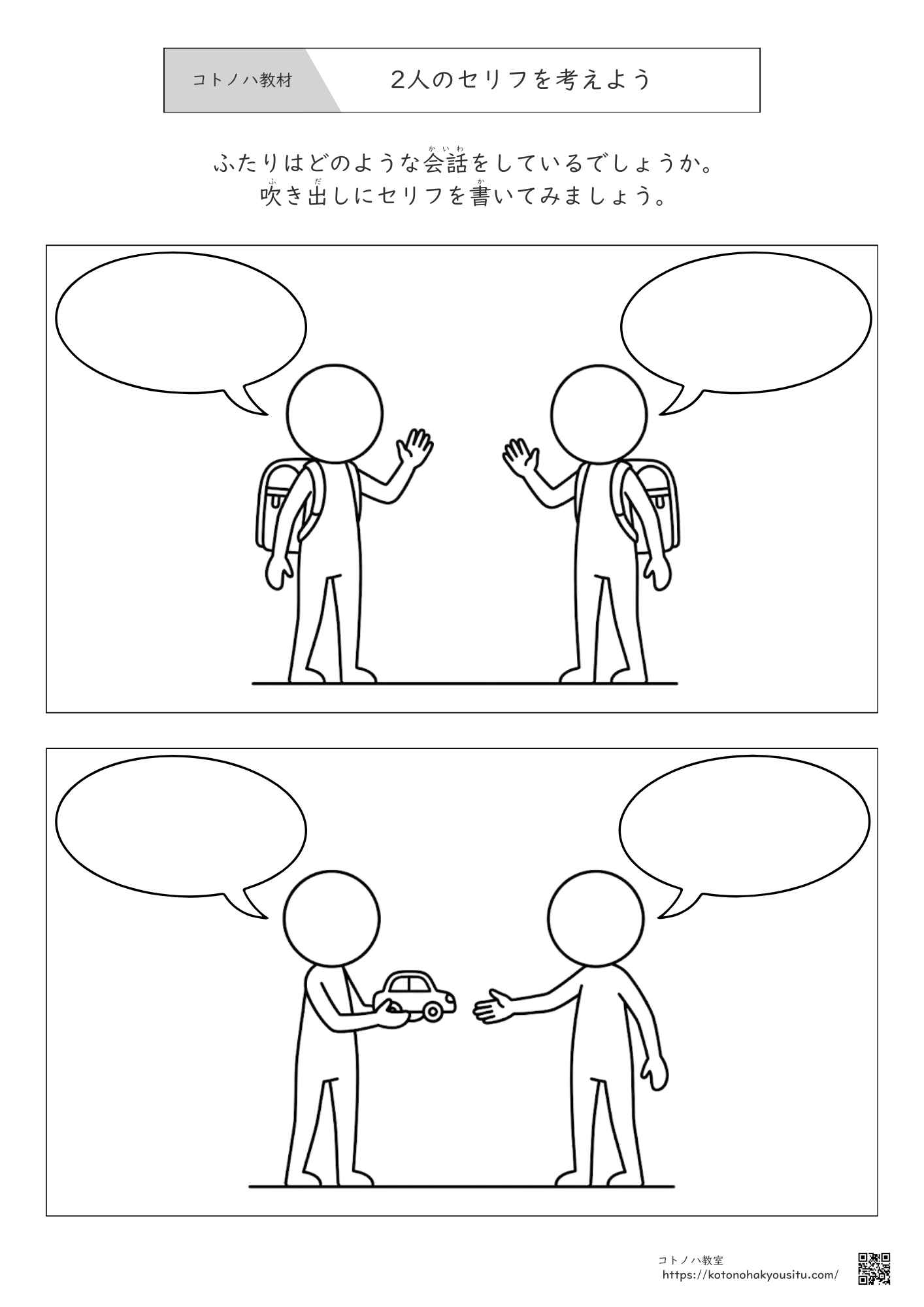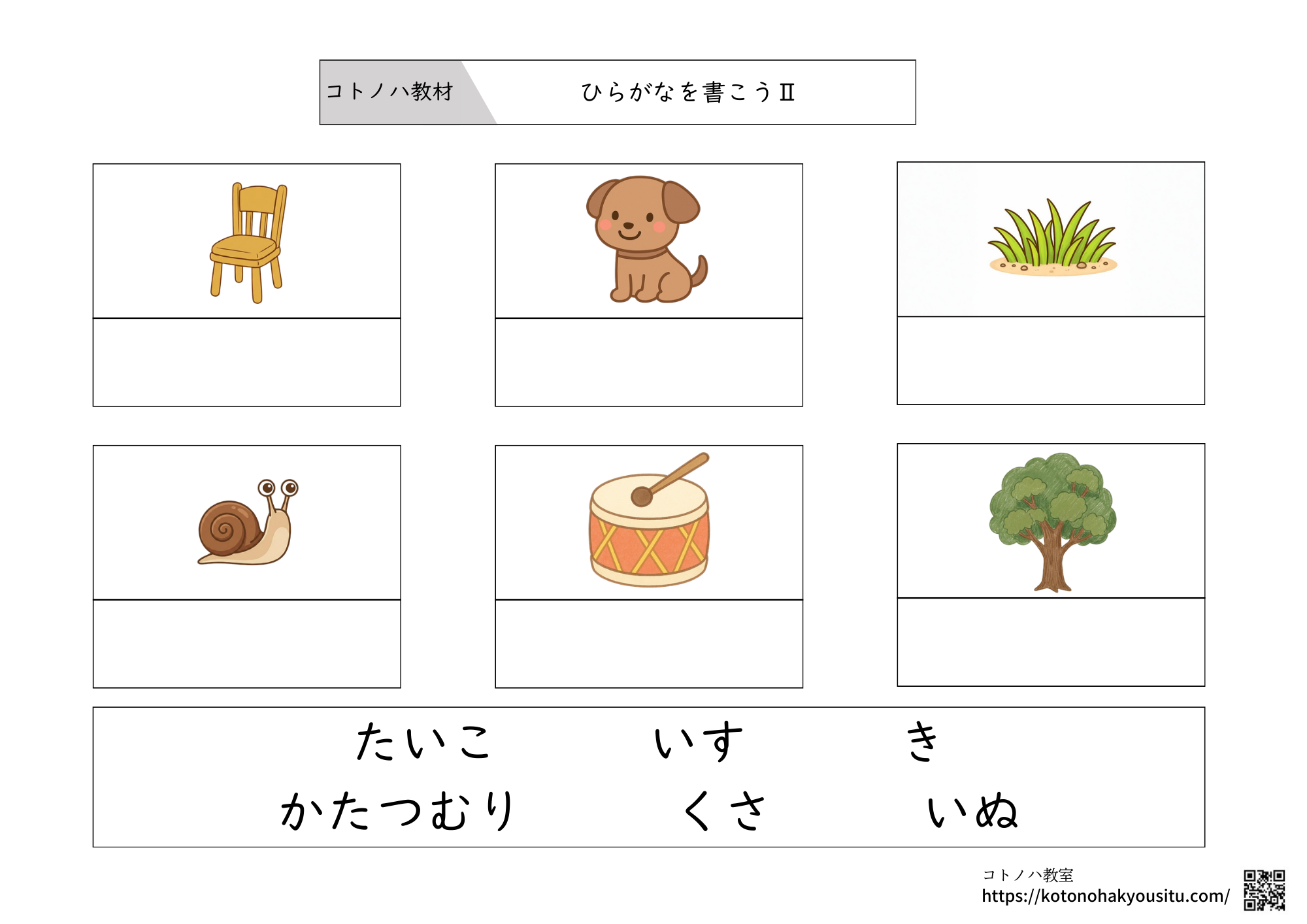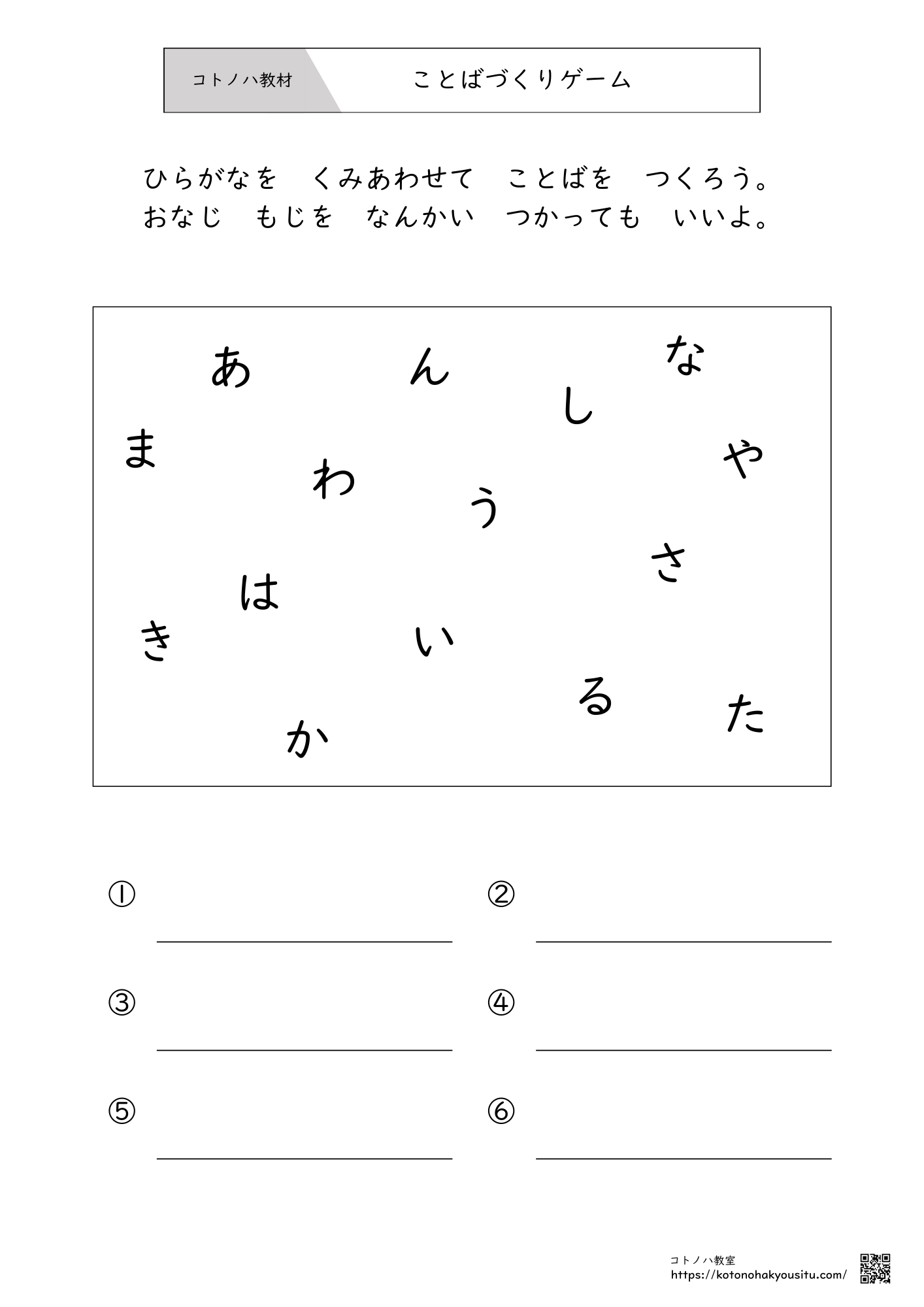 こちらのページではコトノハ教室が作成した教材をまとめています。各教材のリンクをクリックするとそれぞれのページへ移動できるため、そちらからダウンロードして使って下さい。
