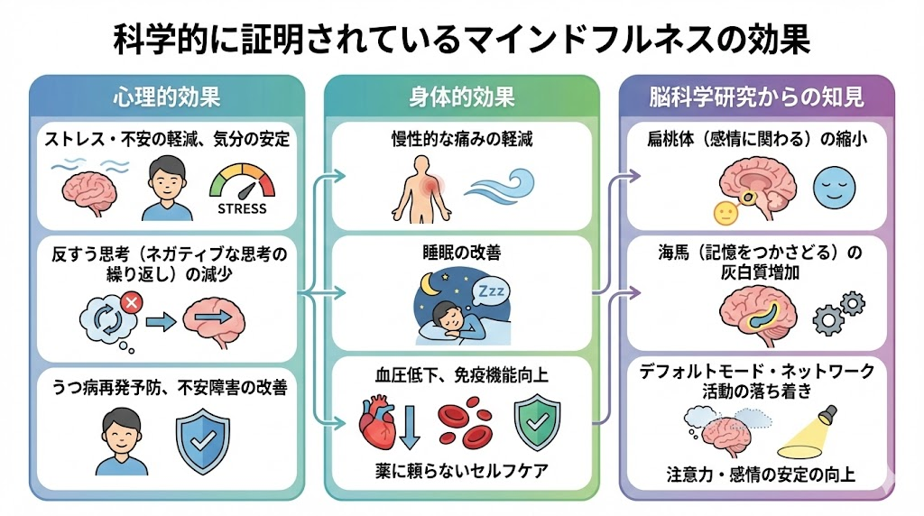 身体的な効果も見逃せません。慢性的な痛みの軽減、睡眠の改善、血圧低下、免疫機能の向上などが研究で示されており、薬に頼らないセルフケアとしても注目されています。