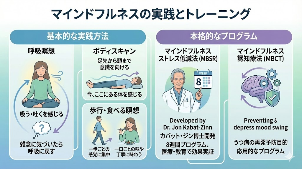また、うつ病の再発予防を目的とした「マインドフルネス認知療法(MBCT)」など応用的なプログラムも開発されています。