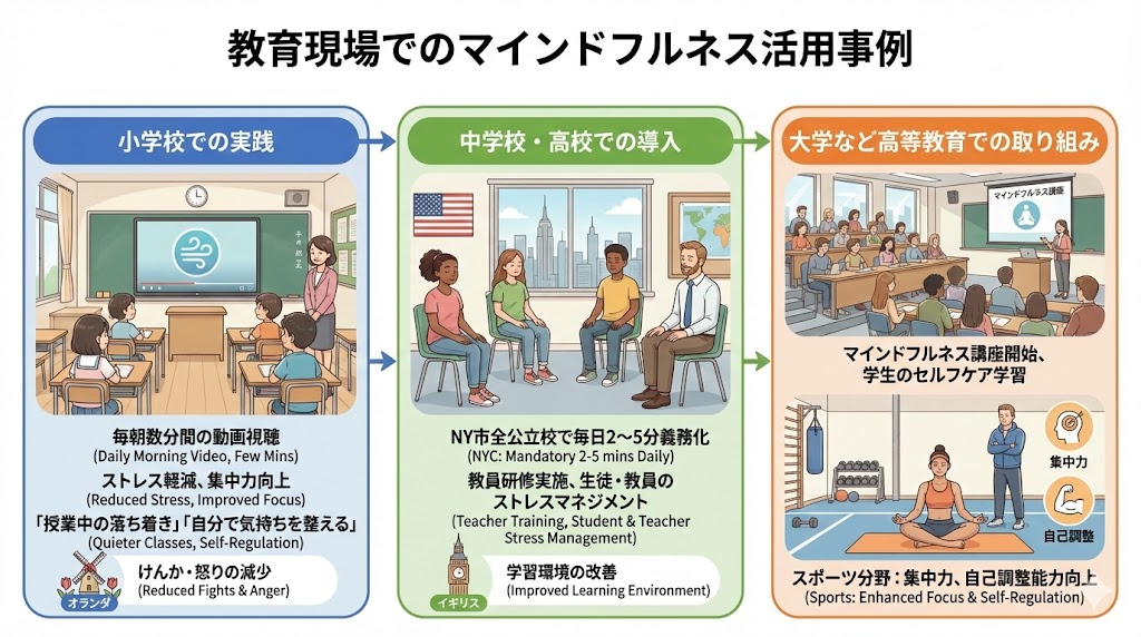 アメリカ・ニューヨーク市では全ての公立校で毎日2~5分のマインドフルネス呼吸法が義務化されました。教員にも研修が行われ、生徒だけでなく先生自身のストレスマネジメントにもつながっています。イギリスでも数万人規模の中学生を対象に実証研究が進められ、学習環境の改善に役立つことが示されています。