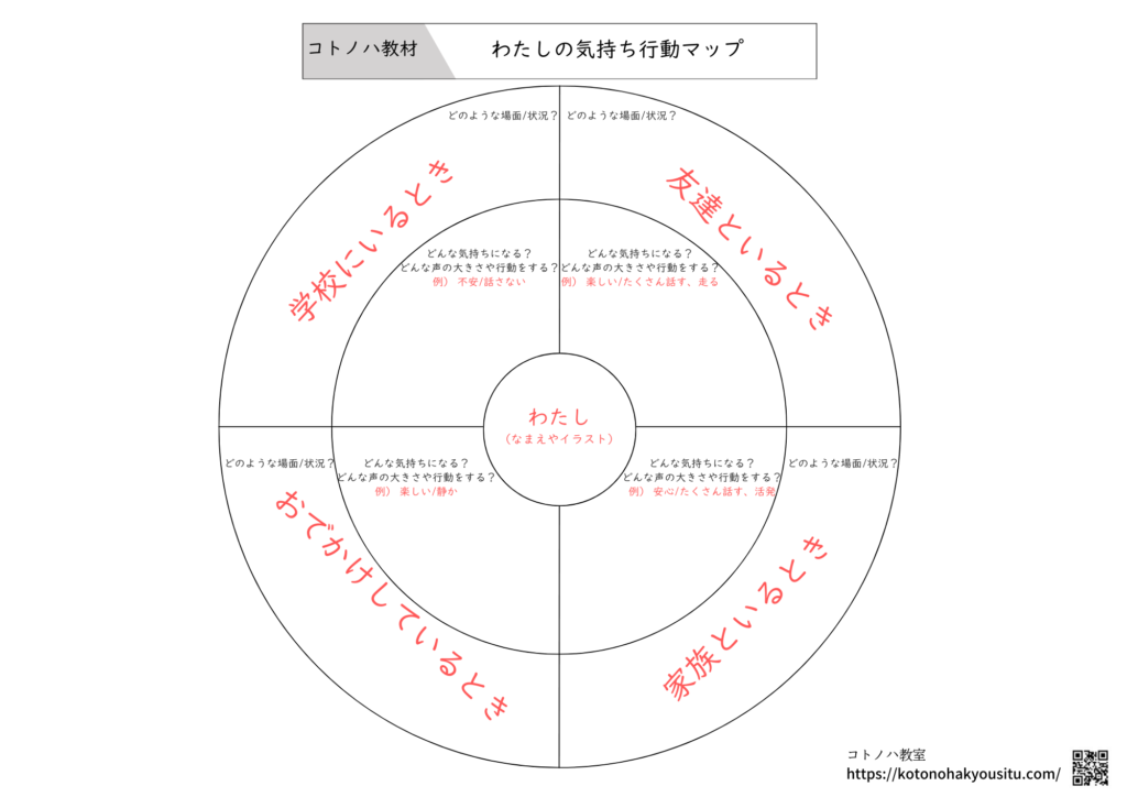 このプリントのポイントは、ある状況下で起きている「自分の感情」と「外に現れる行動」を分けて整理できる点です。