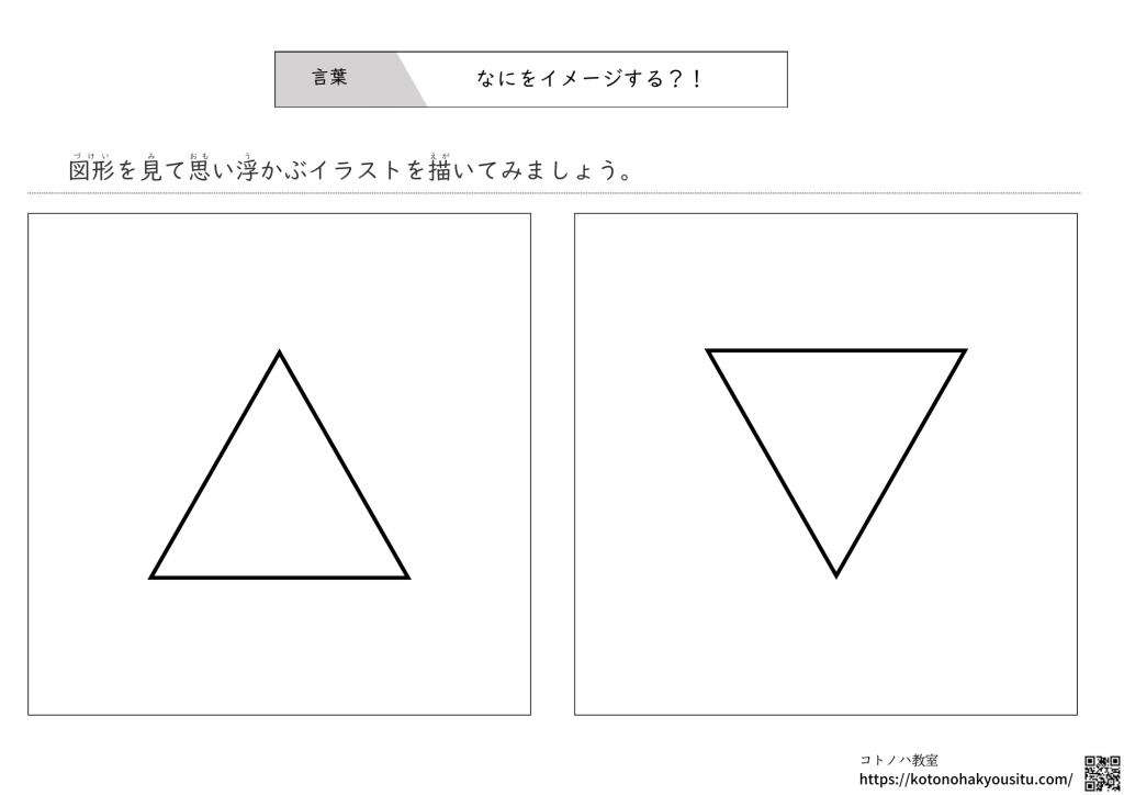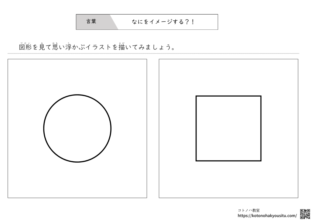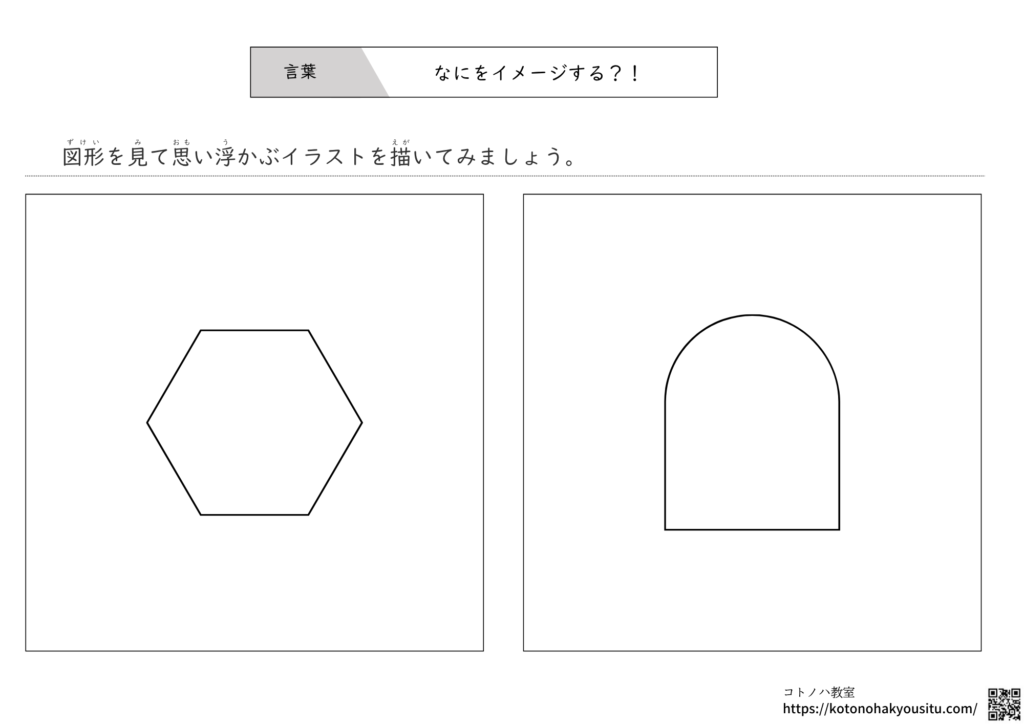 図形からイメージする絵を実際に描いて想像する力を身に付けるプリントです。