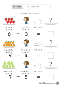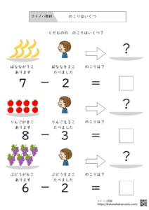 HOME > 無料教材 > 数の学習 > のこりはいくつ【無料プリント】~引き算の始めの一歩 2025年4月18日 引き算の学習をイラストを使って学ぶプリントです。 のこりはいくつ【無料ダウンロード】 ①のこりはいくつ ②のこりはいくつ ③のこりはいくつ ④のこりはいくつ <おすすめ教材>ことば・ひらがな・社会性・気持ちの学習に役立つ教材集ことばの学習やひらがな練習、社会性や気持ちを考え学習など、子どもの発達を支える教材をまとめました。どれも家庭や学校、療育の場で手軽に使えるものばかりです。言葉の学習で役立つ本、教材ひらがな指導に役立つ本SST・気持ちの学習に役立つ本、教材 -数の学習 -教材