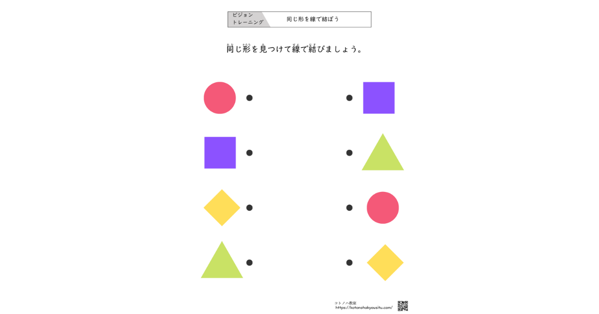 色付き図形は形だけでなく、色もヒントとして進めることが出来ます。形の線結び(色付き)で「出来た!」という気持ちを育てていきましょう。