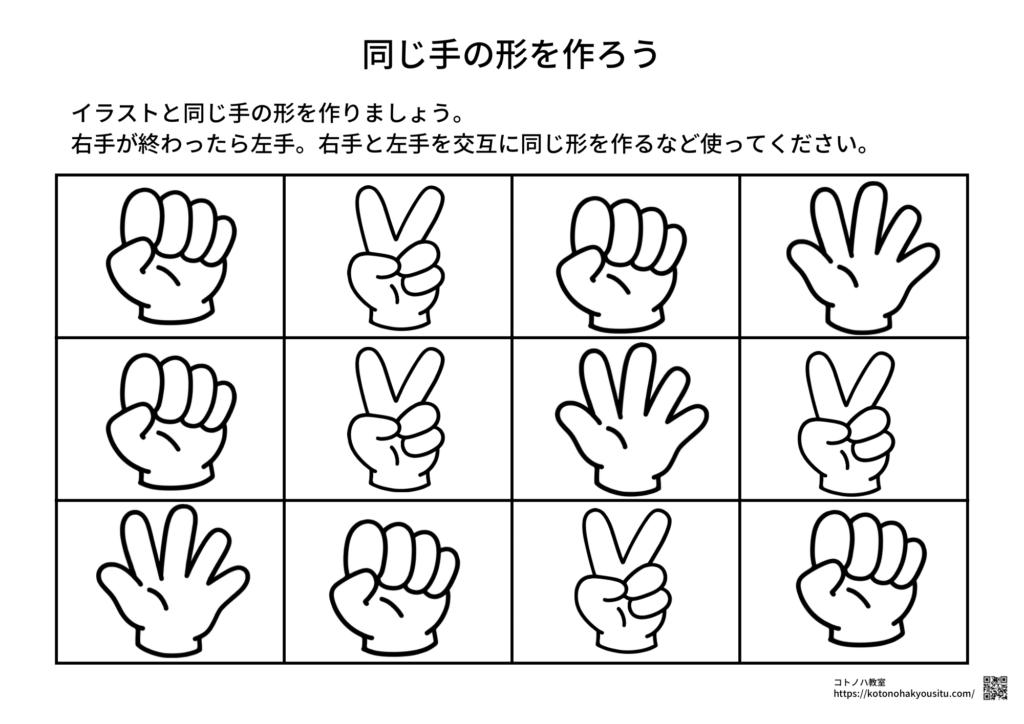 1つずつのマス目に描かれている同じ手の形を作っていき、見た情報(入力)と手の形(出力)の整理を行うことを狙いとしたプリントです。