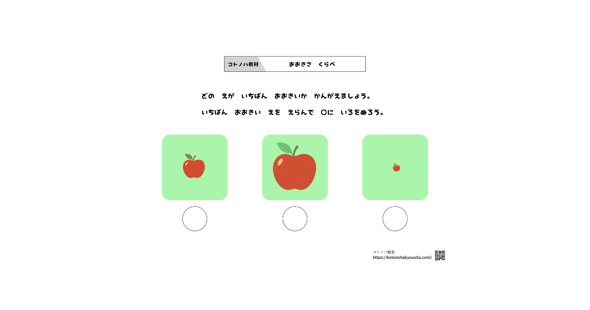 HOME > 無料教材 > 幼児向け教材 > おおきさくらべ【無料プリント】~形容詞の学習に不可欠な大小をみつけるプリント 2025年11月3日 大きい・小さいの概念の習得に合わせたプリントを作成しました。大きいものだけでなく、小さいなものに色を塗ってもらったり、シールを貼ったり、個々に応じて活用してみてください。 おおきさくらべ【無料ダウンロード】 ①おおきさくらべ ②おおきさくらべ <おすすめ教材>ことば・ひらがな・社会性・気持ちの学習に役立つ教材集ことばの学習やひらがな練習、社会性や気持ちを考え学習など、子どもの発達を支える教材をまとめました。どれも家庭や学校、療育の場で手軽に使えるものばかりです。言葉の学習で役立つ本、教材ひらがな指導に役立つ本SST・気持ちの学習に役立つ本、教材 -幼児向け教材