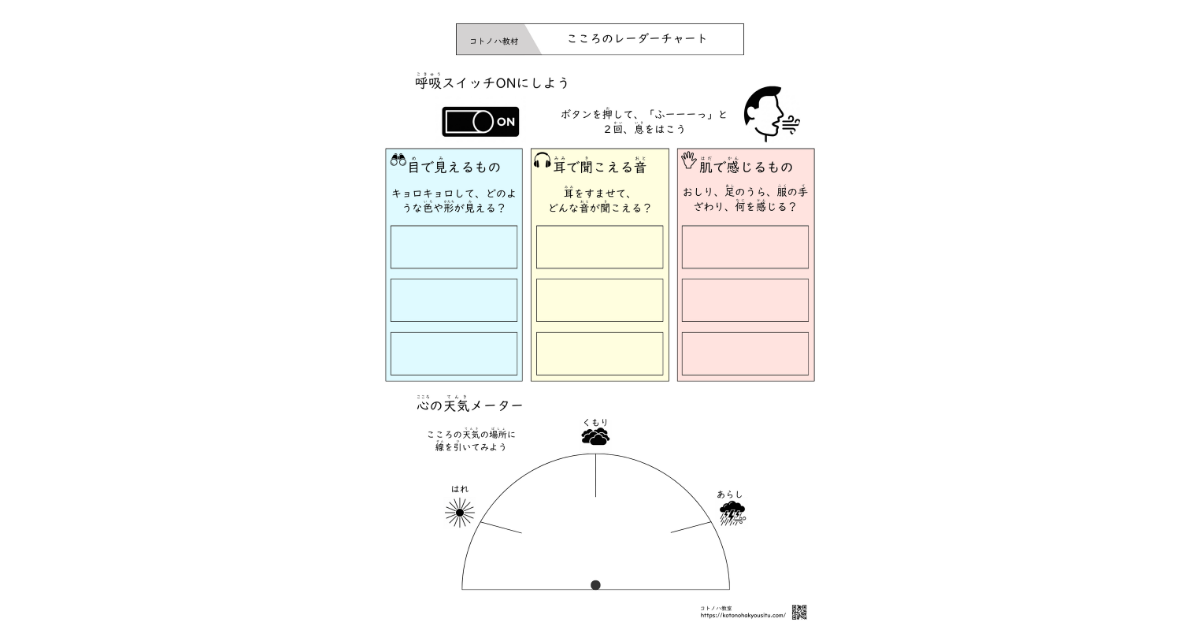 今回作成したのは、心理療法(ACTや認知行動療法)で使われる「グラウンディング」という技法を、子どもたちが楽しく使えるようにアレンジしたワークシートです。