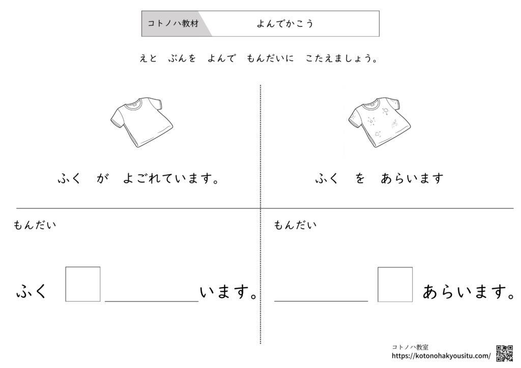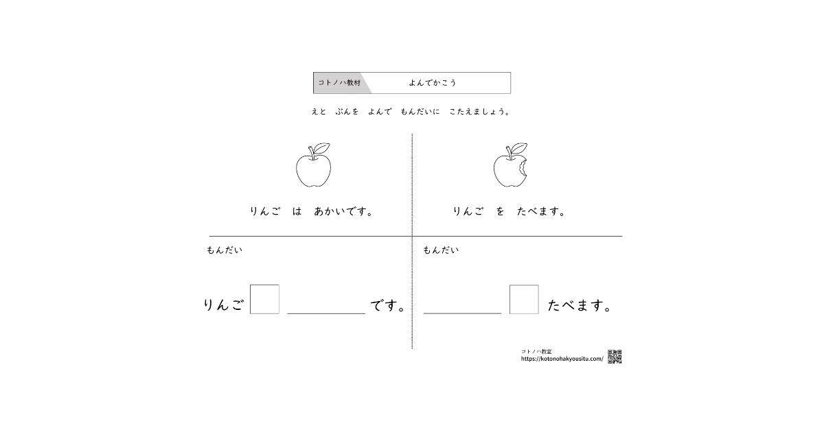 「りんごは」と「りんごを」。 たった一文字の違いを、絵を見比べるだけで直感的に学べるプリントです。