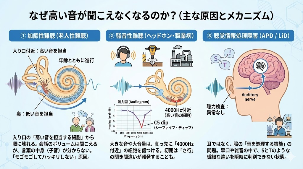 耳の中にある「高音を受け取るアンテナ」が少し摩耗し、音の信号を正しく脳に送れなくなっているだけの物理的な現象です。