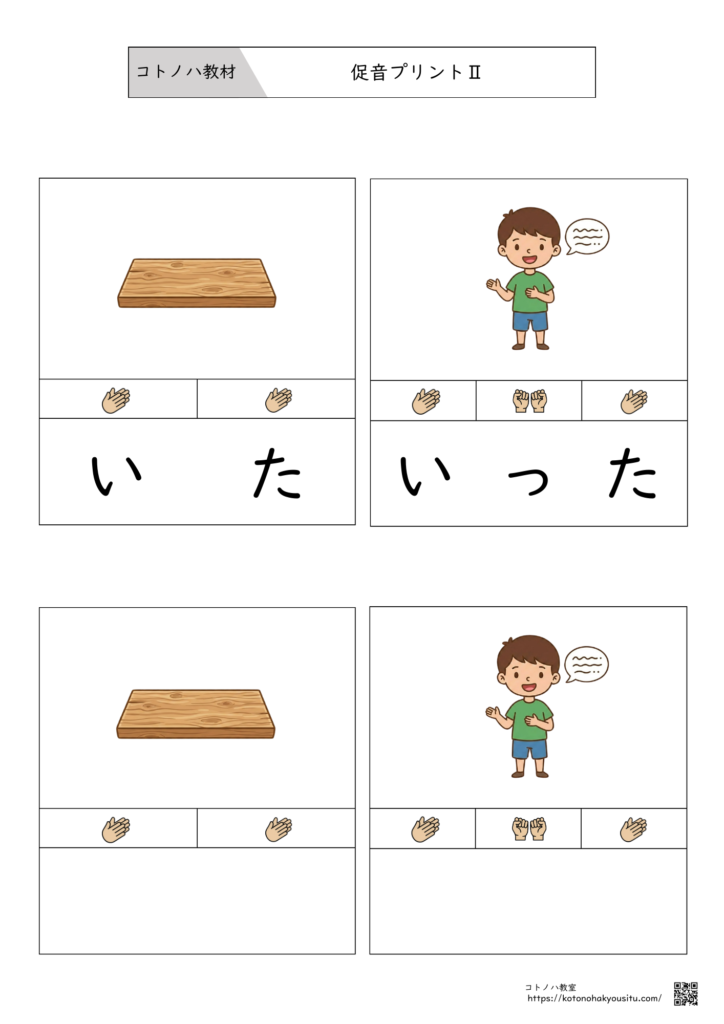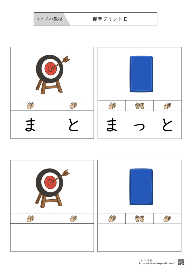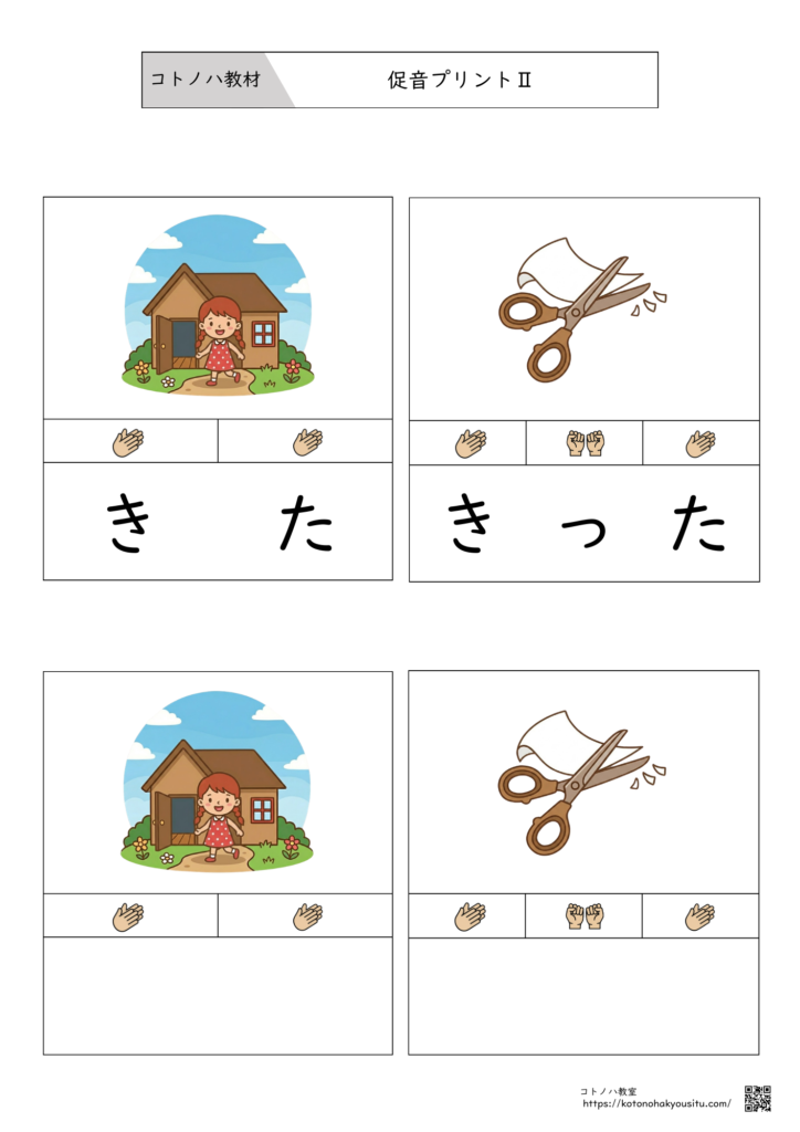 このプリントは、促音(小さい「つ」)が入る言葉と入らない言葉を、イラストを見ながら楽しく学べる学習教材です。手をたたくアイコン、促音部分は手を握るアイコンを参考に、「音のリズム」を感じながら文字を書く練習ができます。