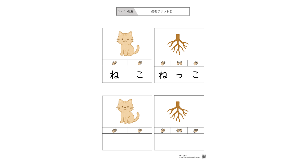 このプリントは、促音(小さい「つ」)が入る言葉と入らない言葉を、イラストを見ながら楽しく学べる学習教材です。手をたたくアイコン、促音部分は手を握るアイコンを参考に、「音のリズム」を感じながら文字を書く練習ができます。