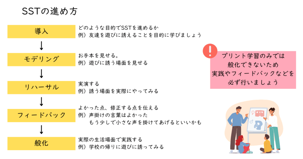 そのためプリント学習やロールプレイを実施するだけでなく、必ず実生活場面と照らし合わせて進めることがSSTとしての効果を最大限に発揮できます。