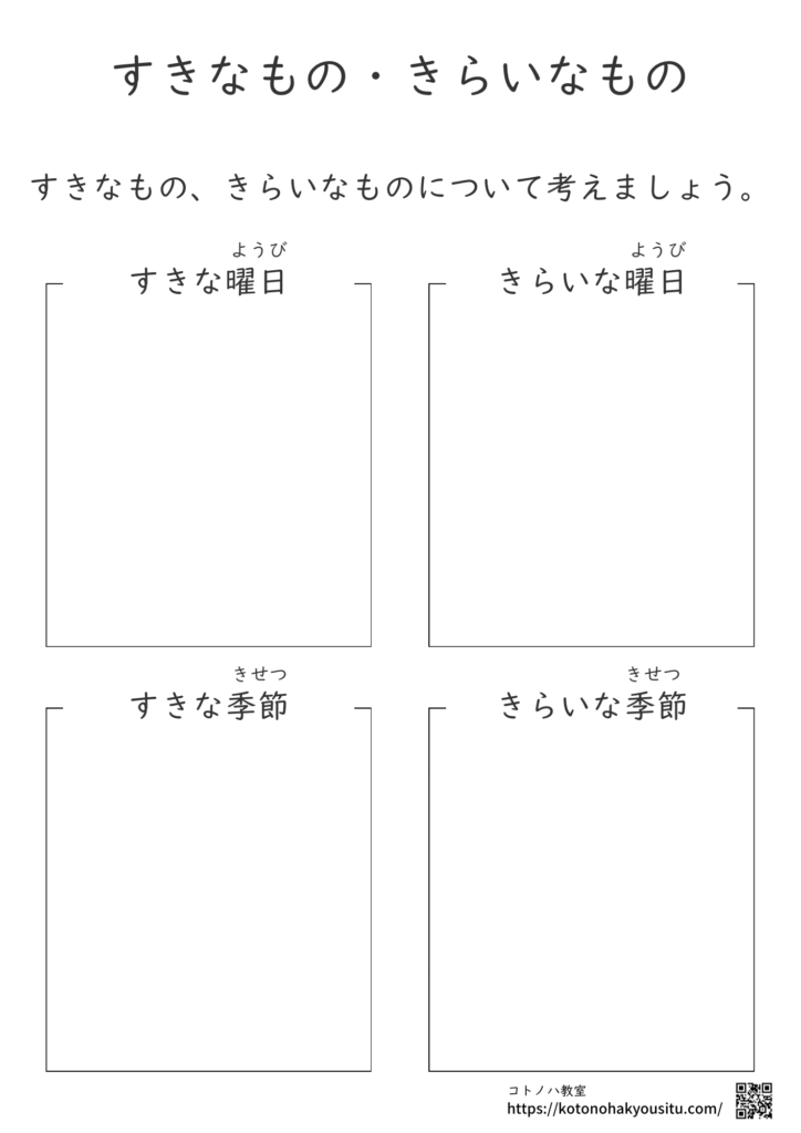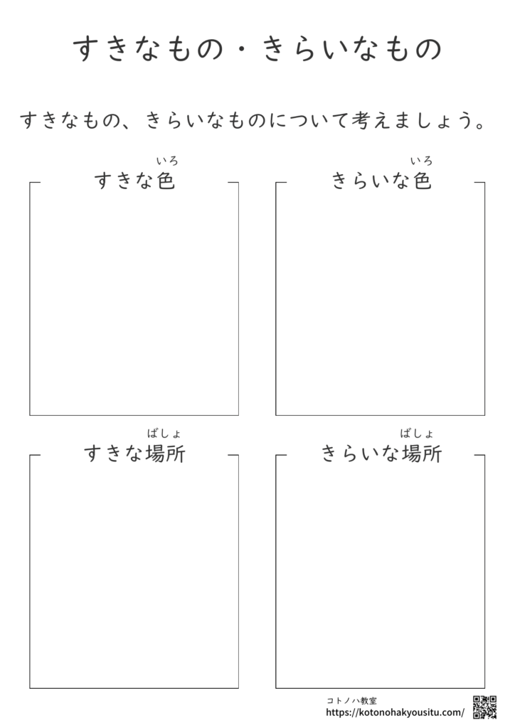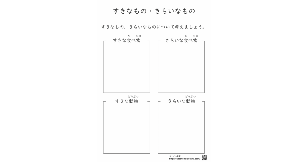 誰にでも好きなことや嫌いなことはあります。その好きなもの嫌いなものについて考えていく教材です。それらについて再確認するだけでなく、書いて表現することによって新たなものが見つかるかもしれません。