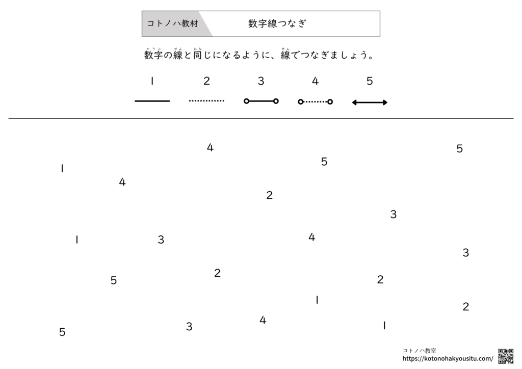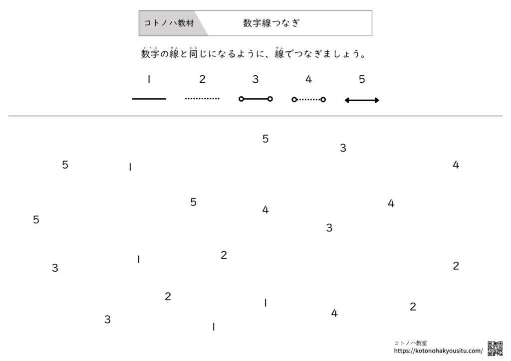このプリントは、散らばった同じ数字同士をつなぐシンプルな遊びですが、実はひと工夫が!数字ごとに「直線」や「点線」「矢印」など、結ぶ線の種類が指定されているんです。