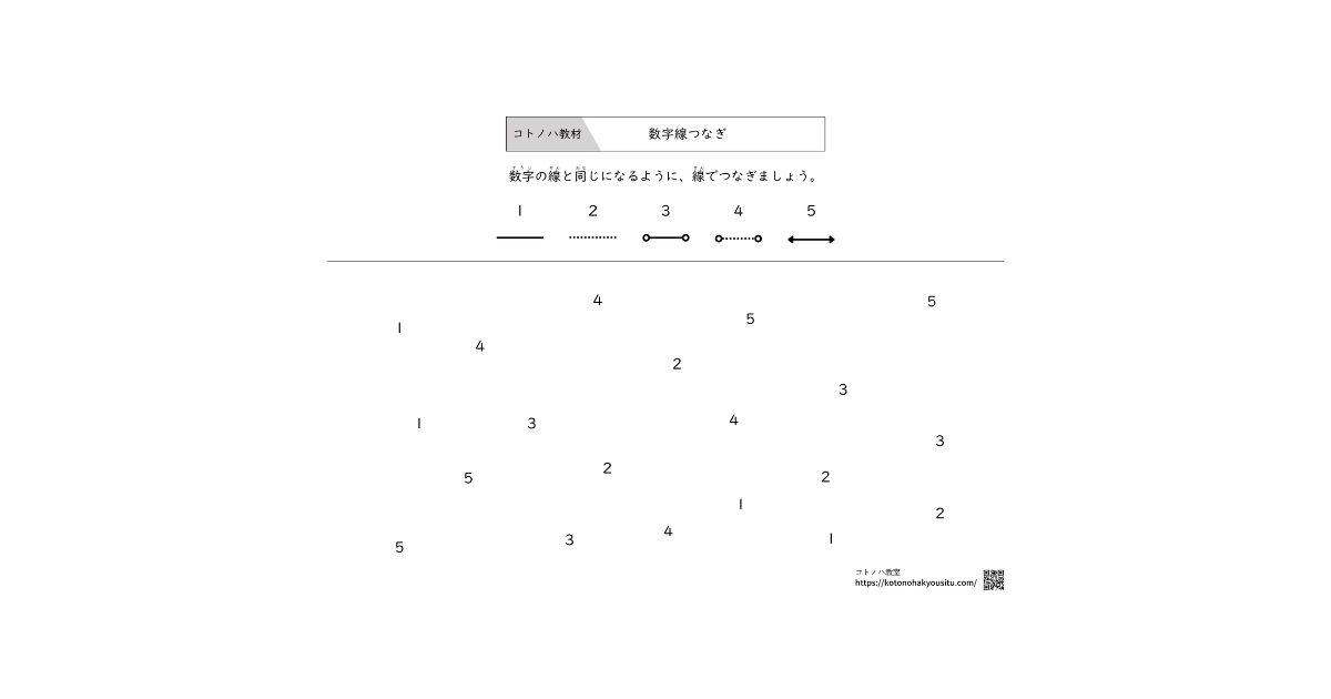このプリントは、散らばった同じ数字同士をつなぐシンプルな遊びですが、実はひと工夫が!数字ごとに「直線」や「点線」「矢印」など、結ぶ線の種類が指定されているんです。
