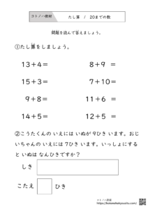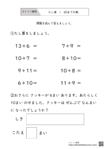 HOME > 無料教材 > 数の学習 > たし算・20までの数【無料プリント】~合計が20までの数 2025年5月31日 足し算の答えが10までの計算や計算問題を加えたプリントです。 たし算・20までの数【無料ダウンロード】 ①たし算・20までの数 ②たし算・20までの数 ③たし算・20までの数 ④たし算・20までの数 -数の学習 -教材