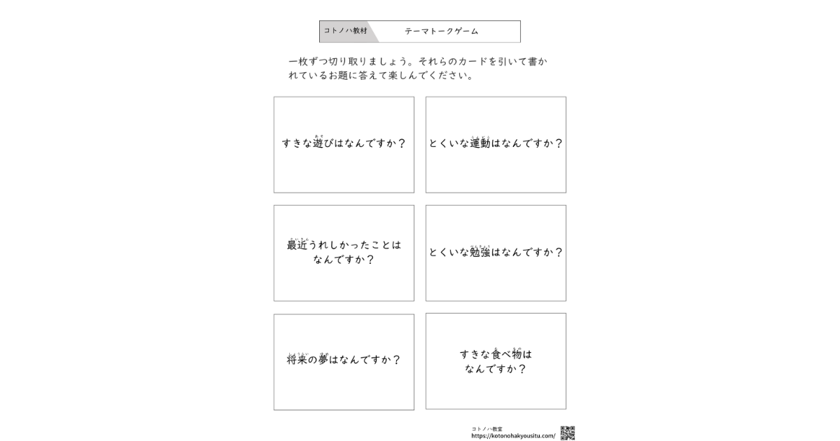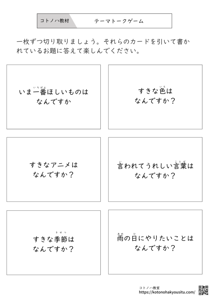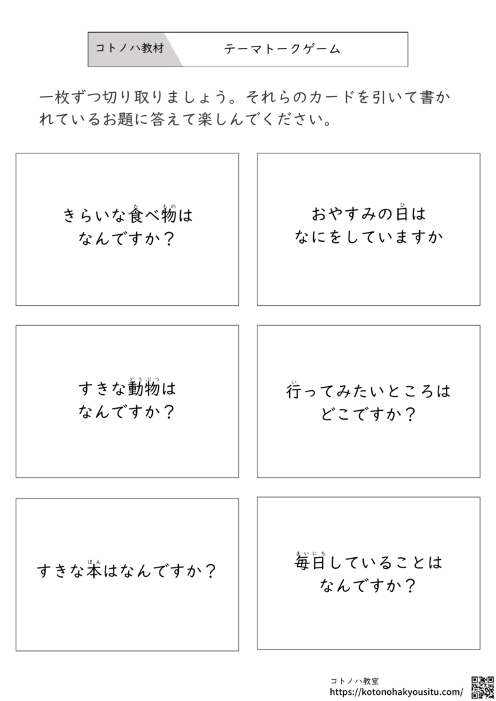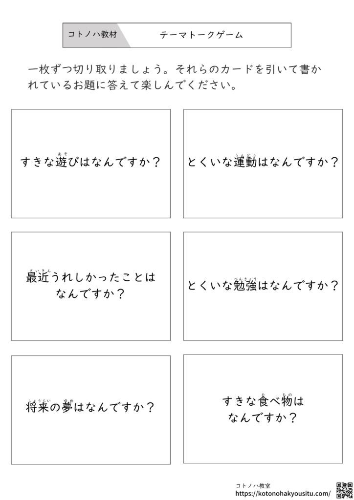 HOME > 無料教材 > 言葉の教材 > テーマトークゲーム【無料プリント】〜お話しのきっかけ作りのワーク・プリント 2024年5月31日 ゲーム性のあるお題に答えていくという教材です。人とのやりとりや話題のきっかけ作りになるようにと思い作成しました。 テーマトークゲームの使い方 使い方 ①印刷後切り取ってください②裏向きに置きランダムに並べる③その中から一枚選びそのお題に答える テーマトークゲーム【無料ダウンロード】 ①テーマトークゲーム ②テーマトークゲーム ③テーマトークゲーム ④テーマトークゲーム ⑤テーマトークゲーム きいて・はなして はなして・きいて トーキングゲーム ¥2,860 (2026/01/26 21:01時点 | Amazon調べ) Amazon \楽天ポイント4倍セール!/ 楽天市場 ポチップ えらんで きめて つたえるゲーム すきなのどっち? ¥2,860 (2026/01/26 21:01時点 | Amazon調べ) Amazon \楽天ポイント4倍セール!/ 楽天市場 ポチップ <おすすめ教材>ことば・ひらがな・社会性・気持ちの学習に役立つ教材集ことばの学習やひらがな練習、社会性や気持ちを考え学習など、子どもの発達を支える教材をまとめました。どれも家庭や学校、療育の場で手軽に使えるものばかりです。言葉の学習で役立つ本、教材ひらがな指導に役立つ本SST・気持ちの学習に役立つ本、教材 -言葉の教材 -教材