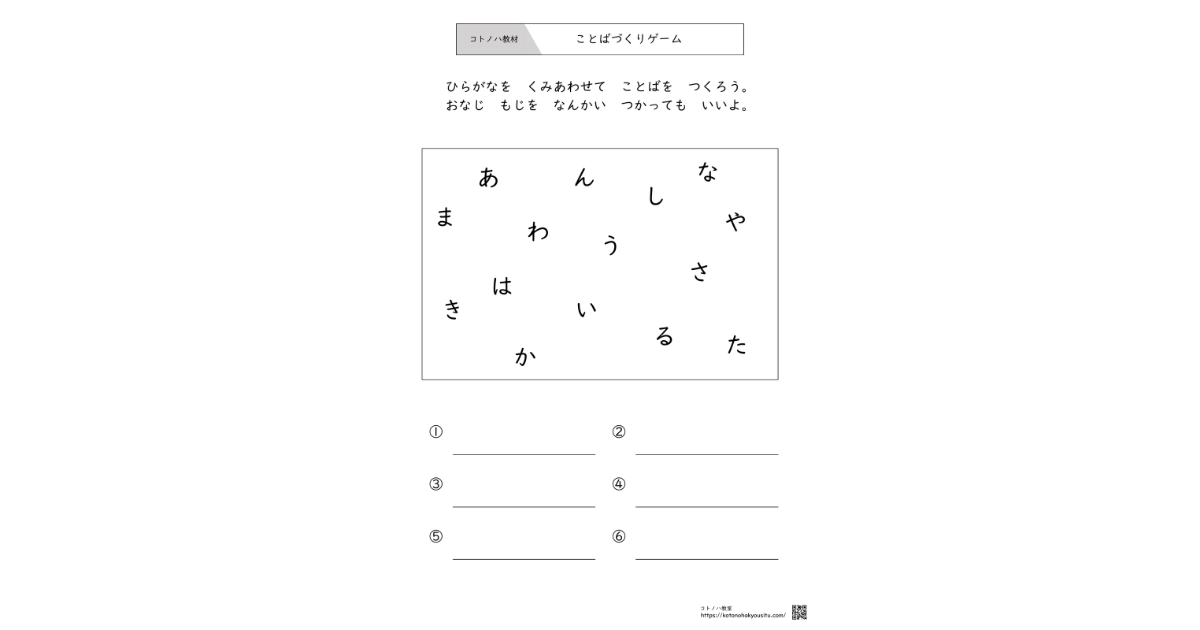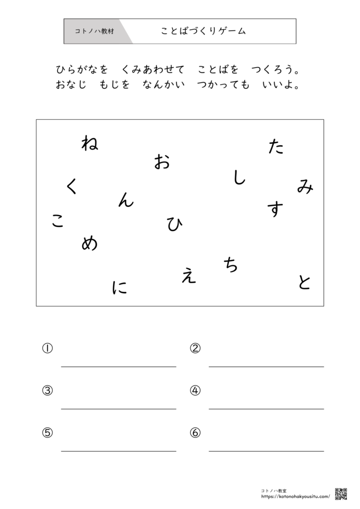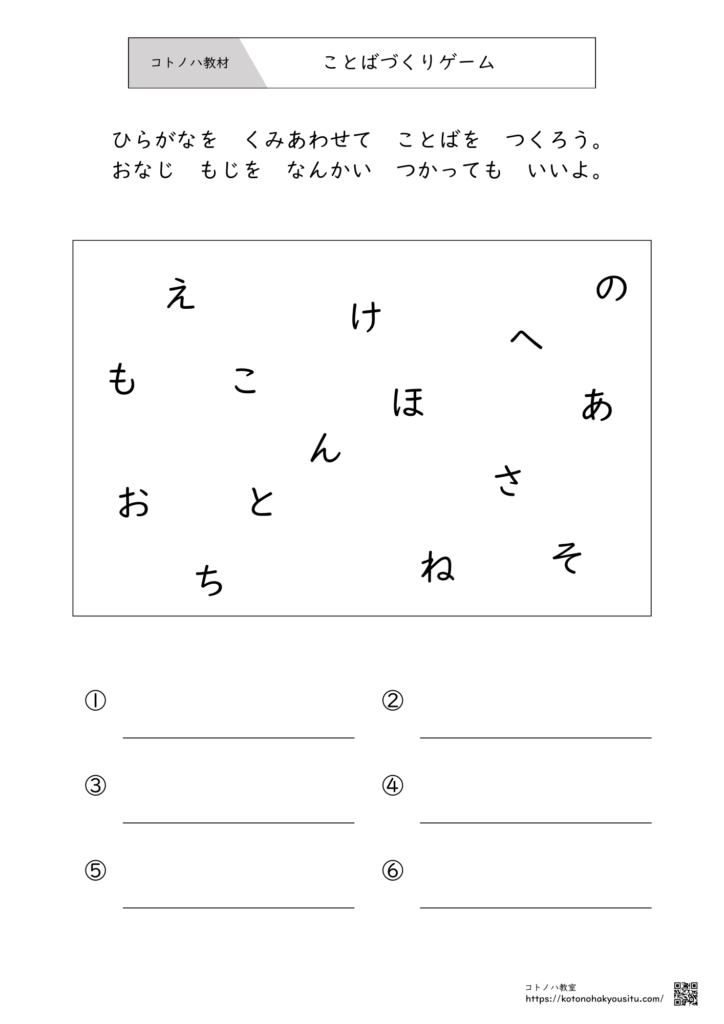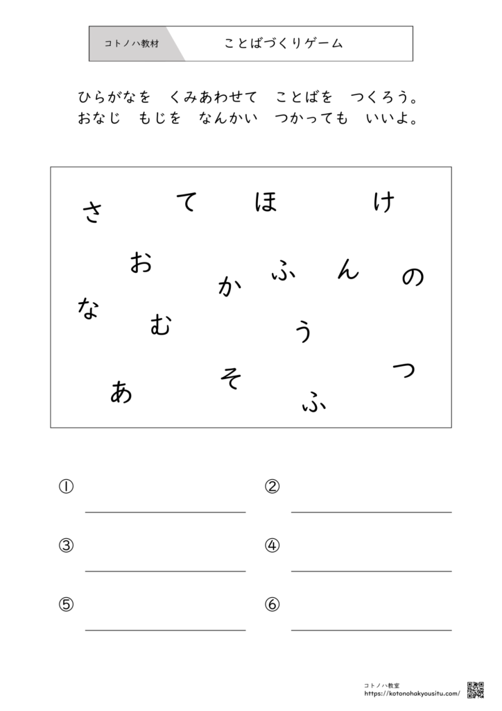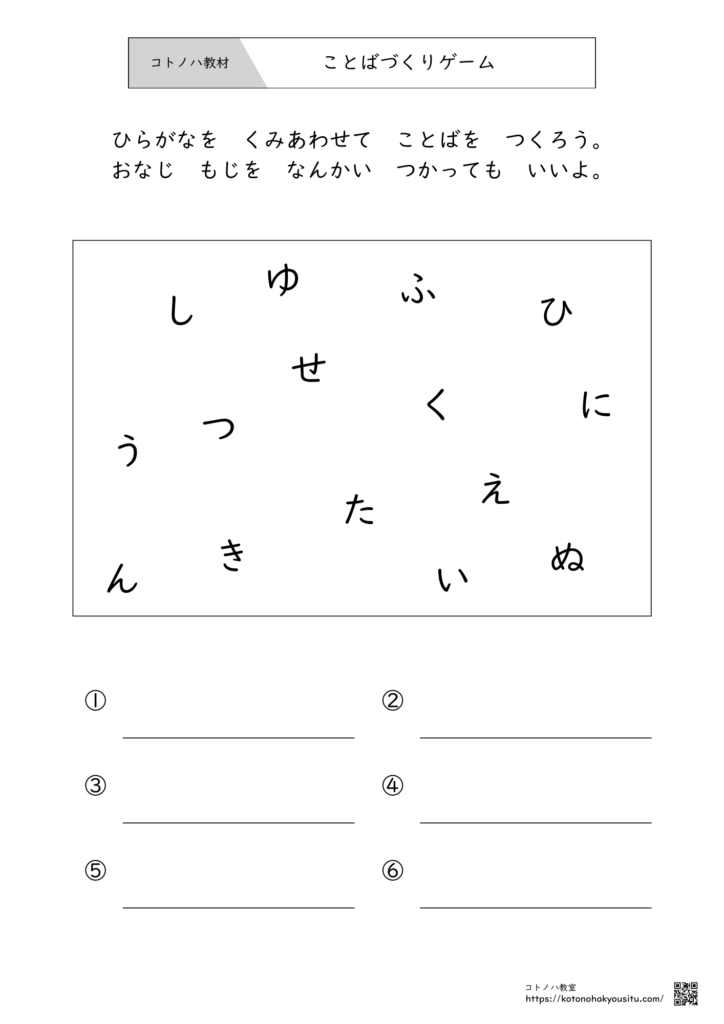 バラバラに散らばった「ひらがな」を組み合わせて、知っている言葉を探し出す「ことばづくりゲーム(ワードビルディング)」のプリントです。